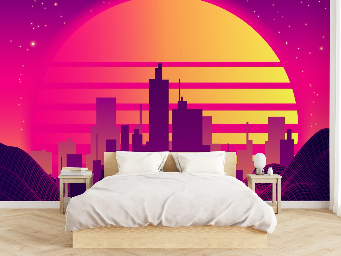- stadtbild, sonnenuntergang, stadt, neon, synthwave, vaporwave, raumschiff, retrowave, retrofuturismus, gitter