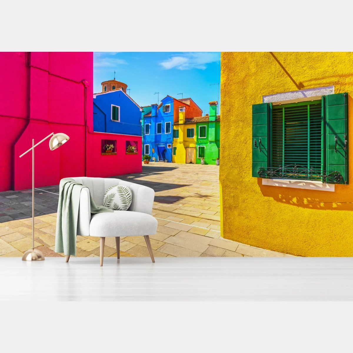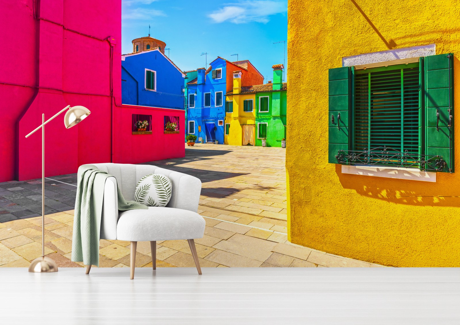 - architektur, reise, gasse, sonnig, italien, bunte häuser, burano, venedig, fensterläden, platz