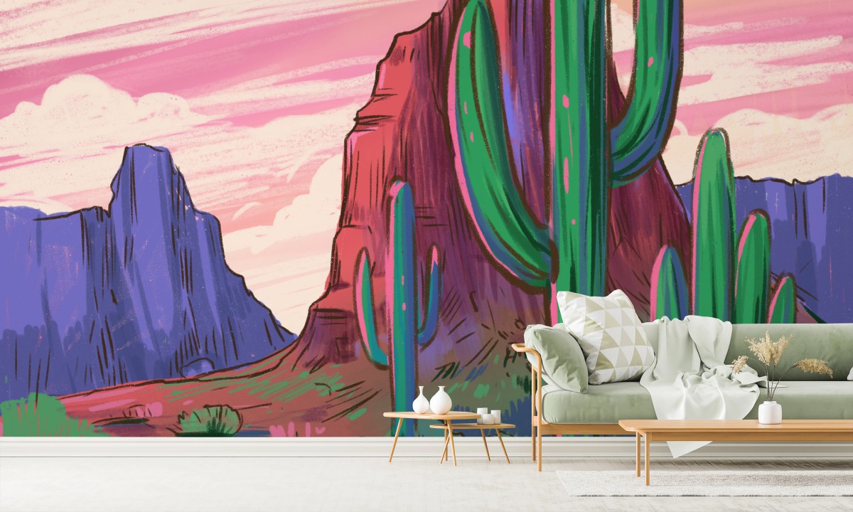 - illustration, sonnenuntergang, landschaft, pastell, pflanzen, canyon, wüste, arizona, südwesten, kakteen
