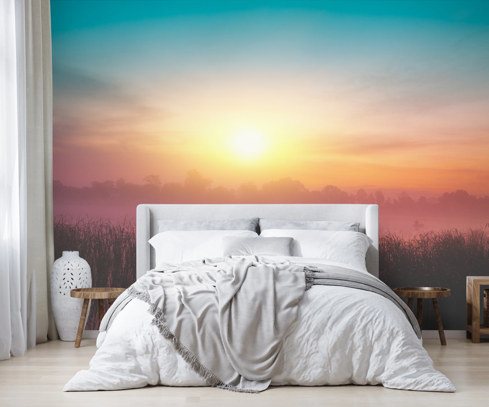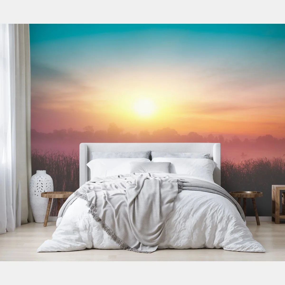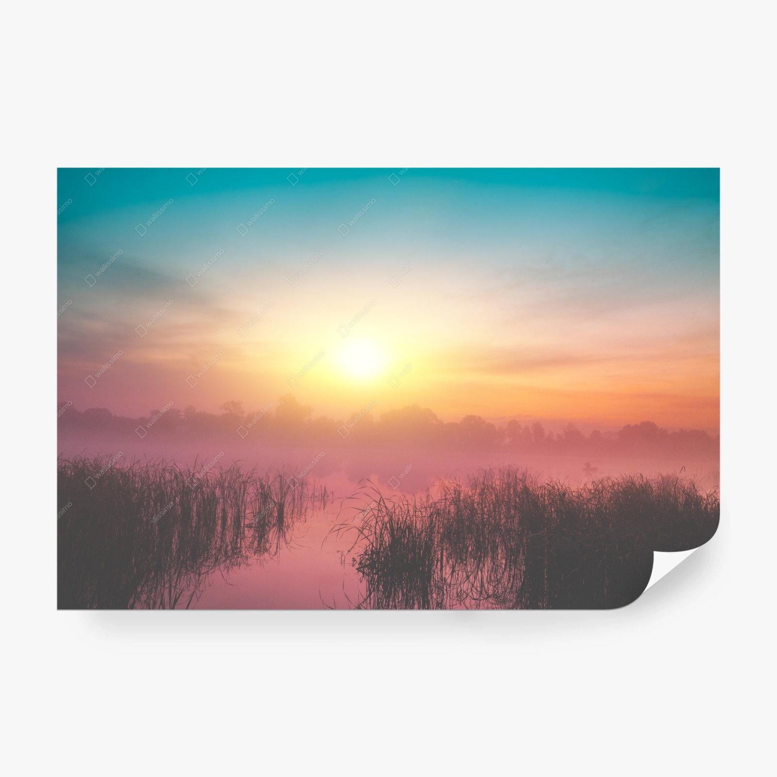 Fototapete Nebeliger sonnenaufgang über stillem see