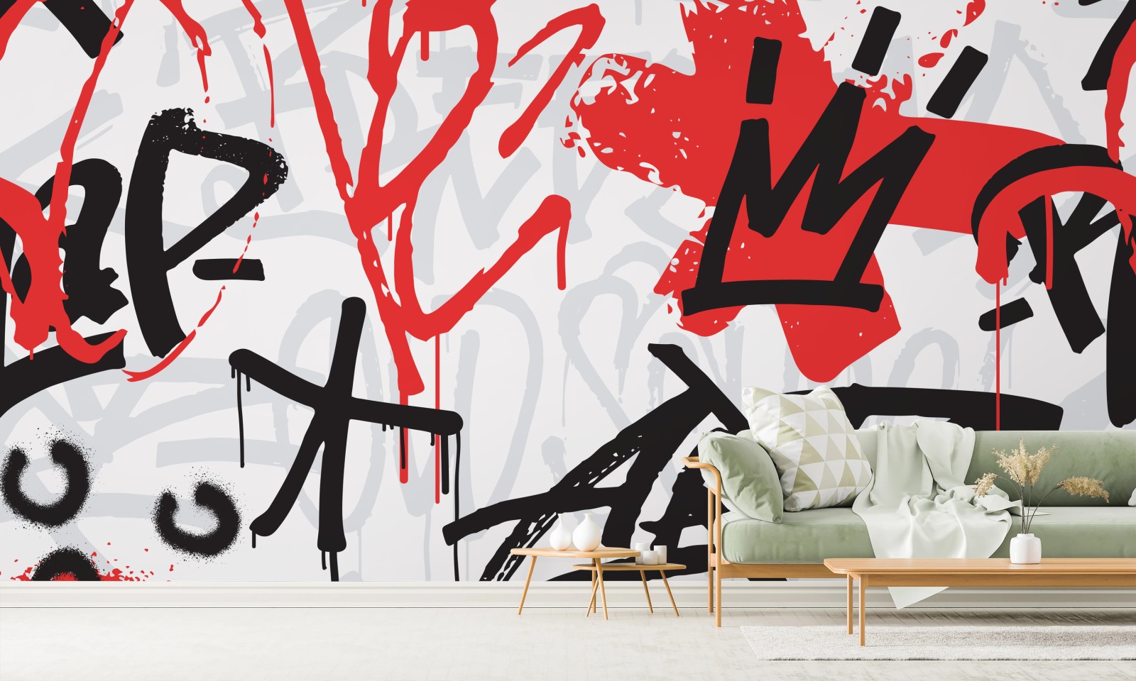Verleihen Sie Ihrem Raum urbanes Flair mit kräftigen roten und schwarzen Graffiti-Motiven, dynamischen Spritzern und handgezeichneten Schriftzügen.MehrWeniger
