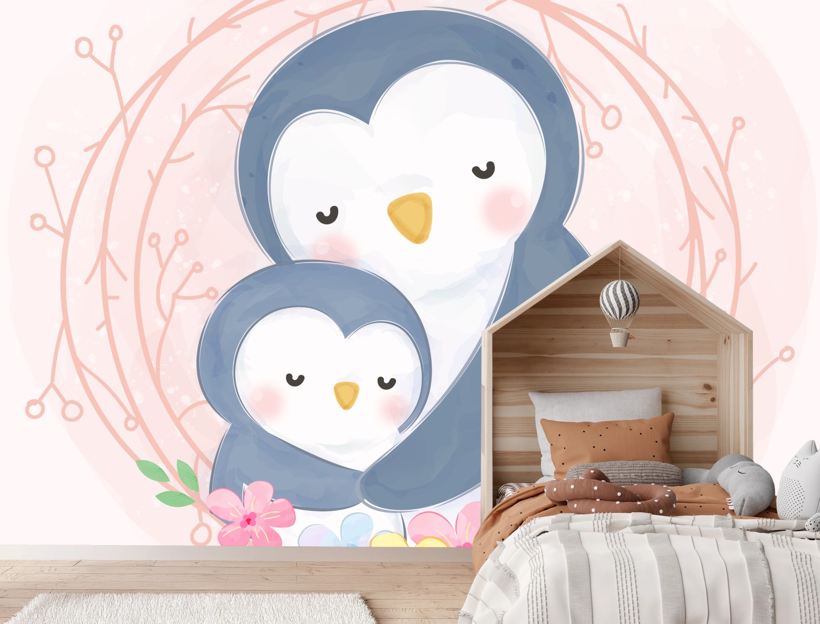 - kinderzimmer, wanddekoration, pinguin, babyzimmer, pastellillustration, blumenkranz, mutter und baby, pinguinfamilie, niedliche tiere, babyparty geschenk