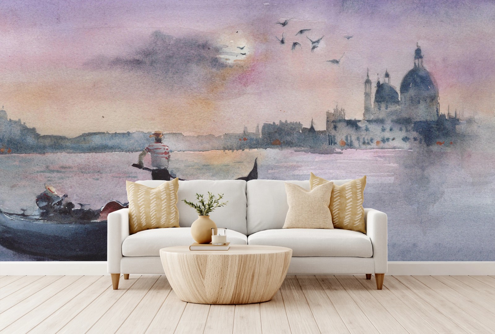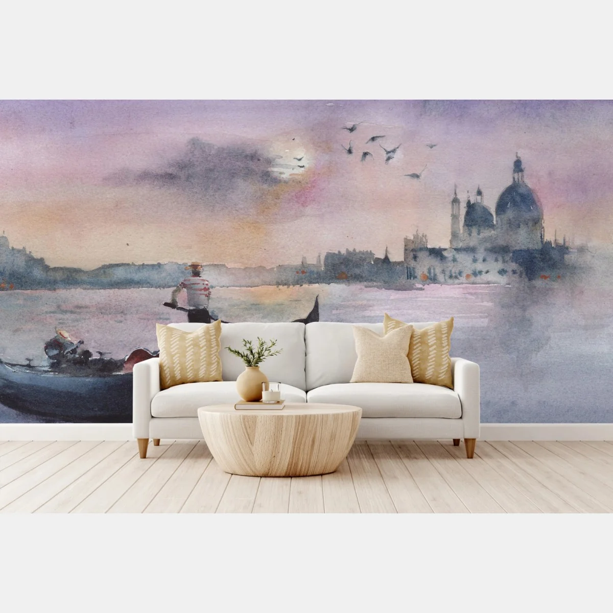 - reisen, sonnenuntergang, panorama, lagune, stadtansicht, aquarell, vögel, romantisch, venedig, gondel