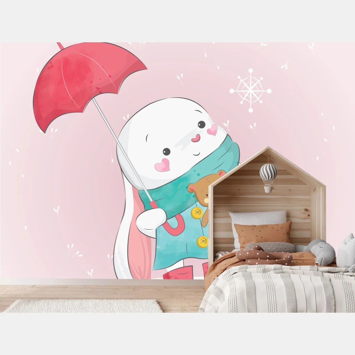 - illustration, kinder, pastell, rosa, winter, hase, märchenhaft, häschen, plüschtier, regenschirm