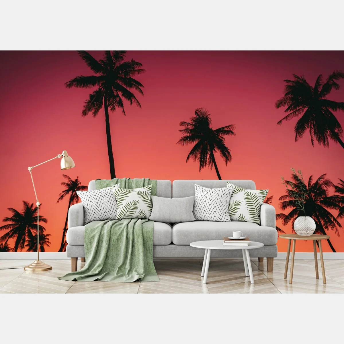 Bringen Sie warme, nostalgische tropische Stimmung in Ihr Zuhause mit diesem Vintage-Palmen-Sonnenuntergangsbild.MehrWeniger