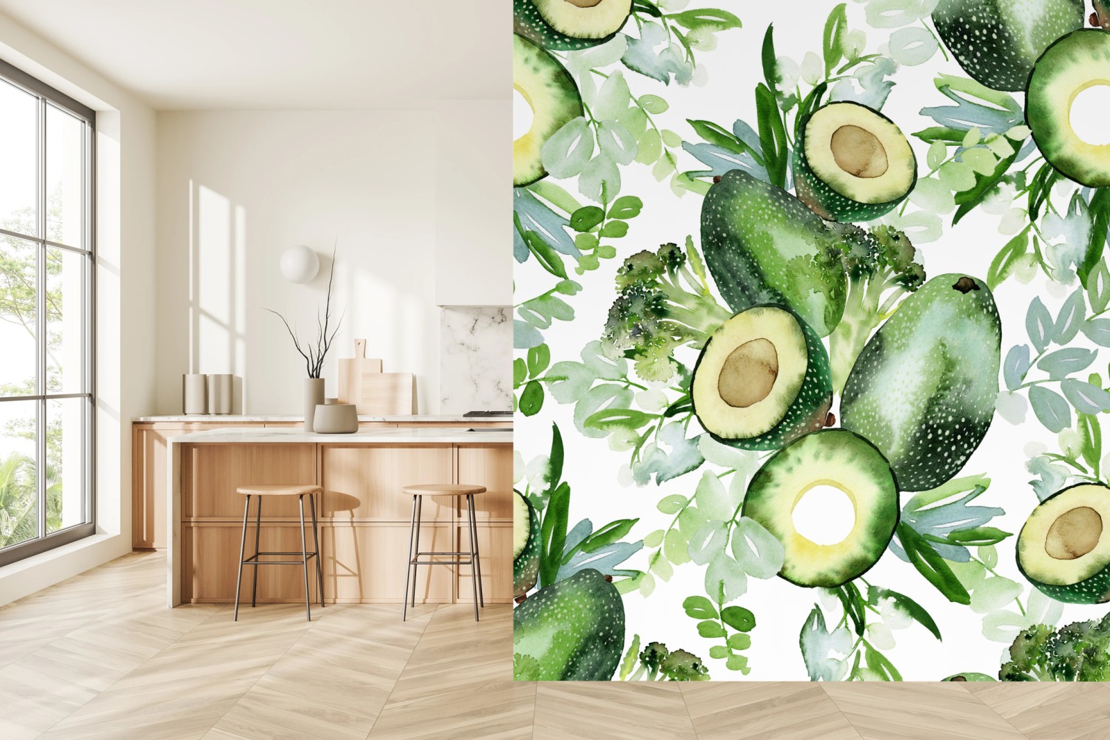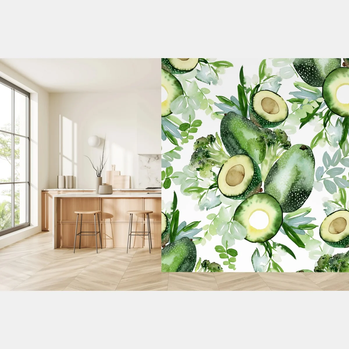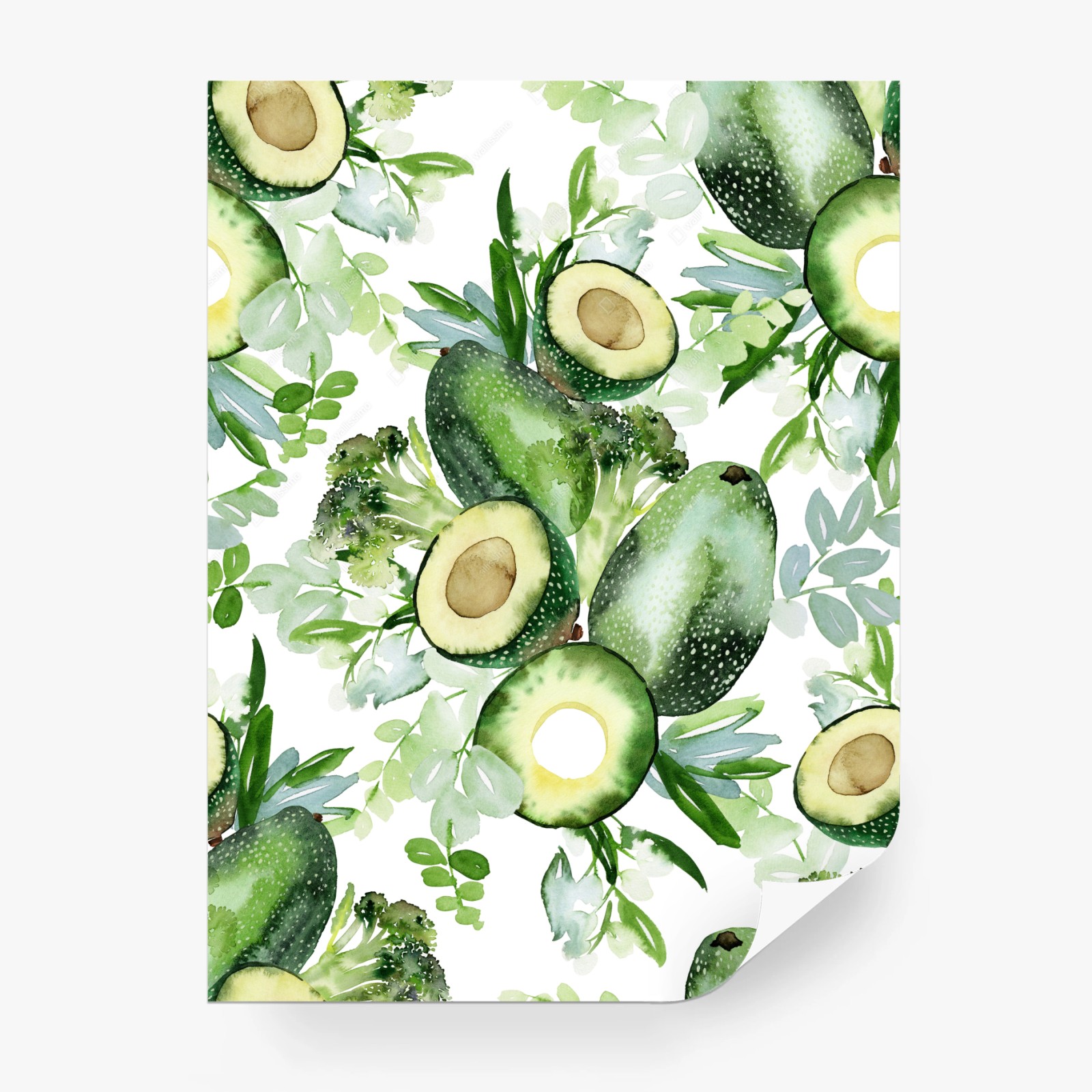 Bringen Sie frischen, natürlichen Charme in Ihren Raum mit diesem Aquarell-Avocado-Muster, ideal für Küche und Essbereiche.MehrWeniger