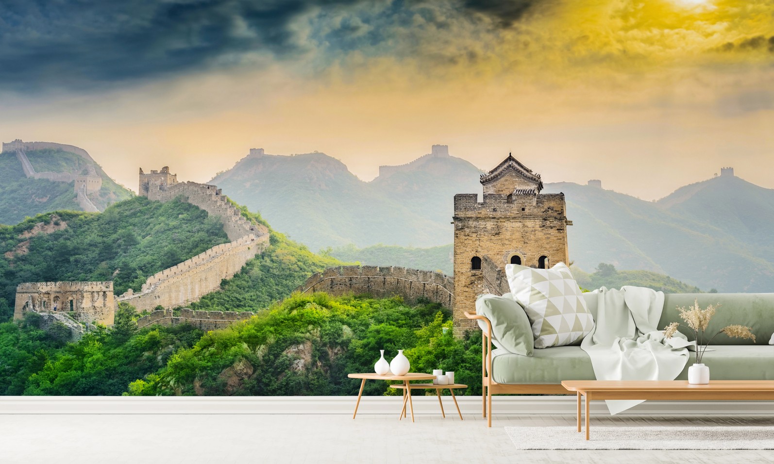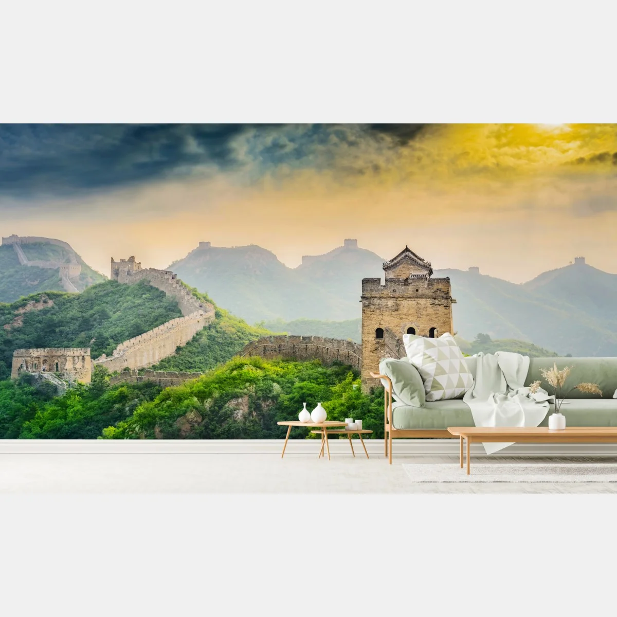 Atemberaubender Panoramablick auf die Chinesische Mauer bei Sonnenaufgang, perfekt, um Ihrem Raum historischen Charme und natürliche Schönheit zu verleihen.MehrWeniger