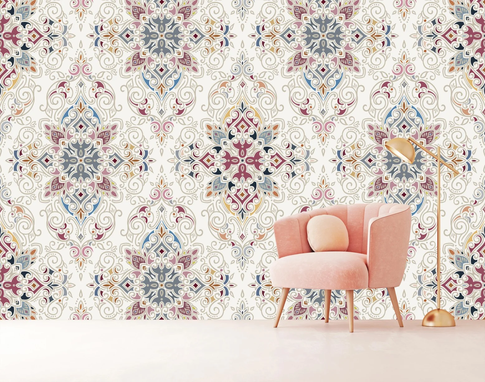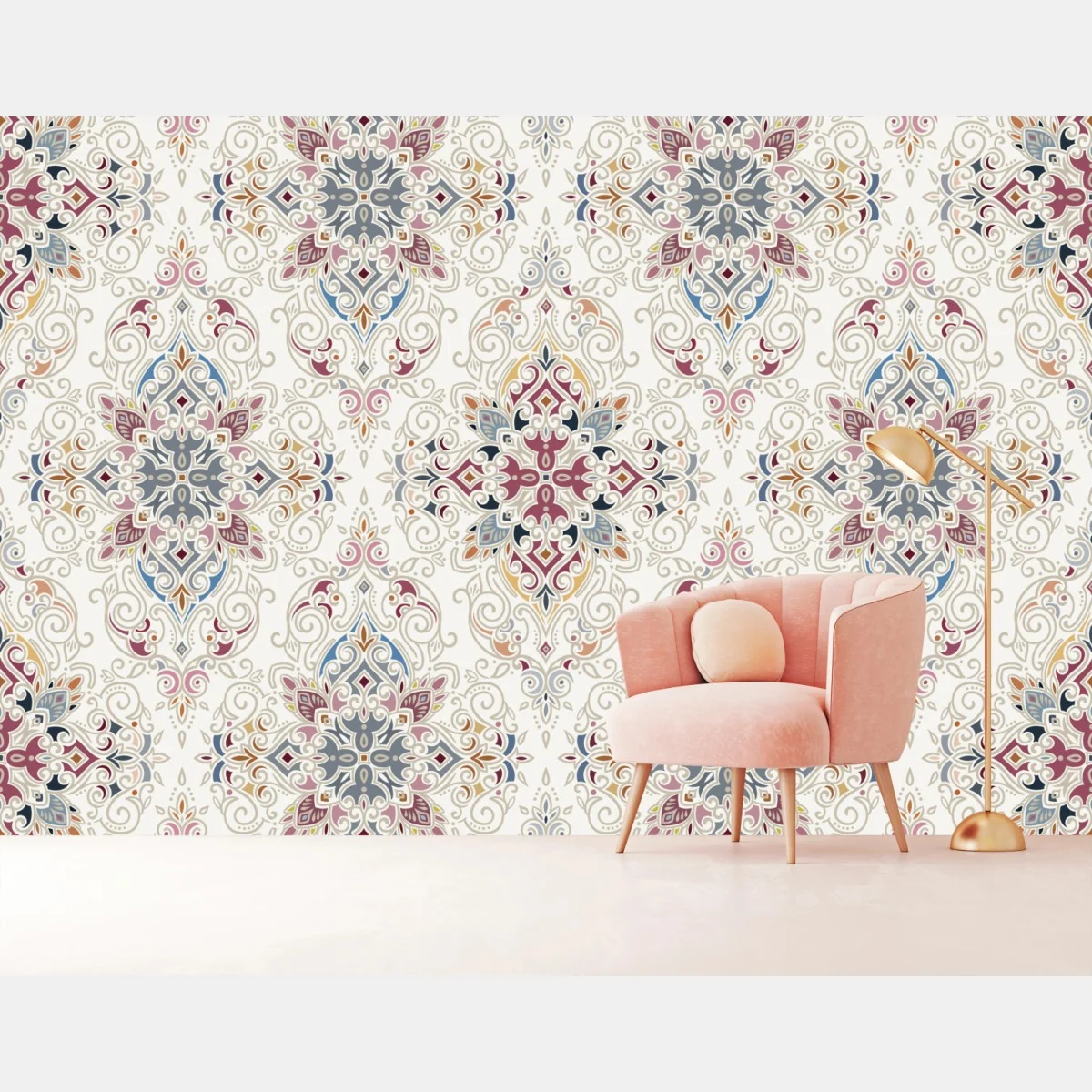 Elegantes Damastmuster in sanften Pastelltönen verleiht jedem Raum zeitlosen Charme und feine Struktur.MehrWeniger