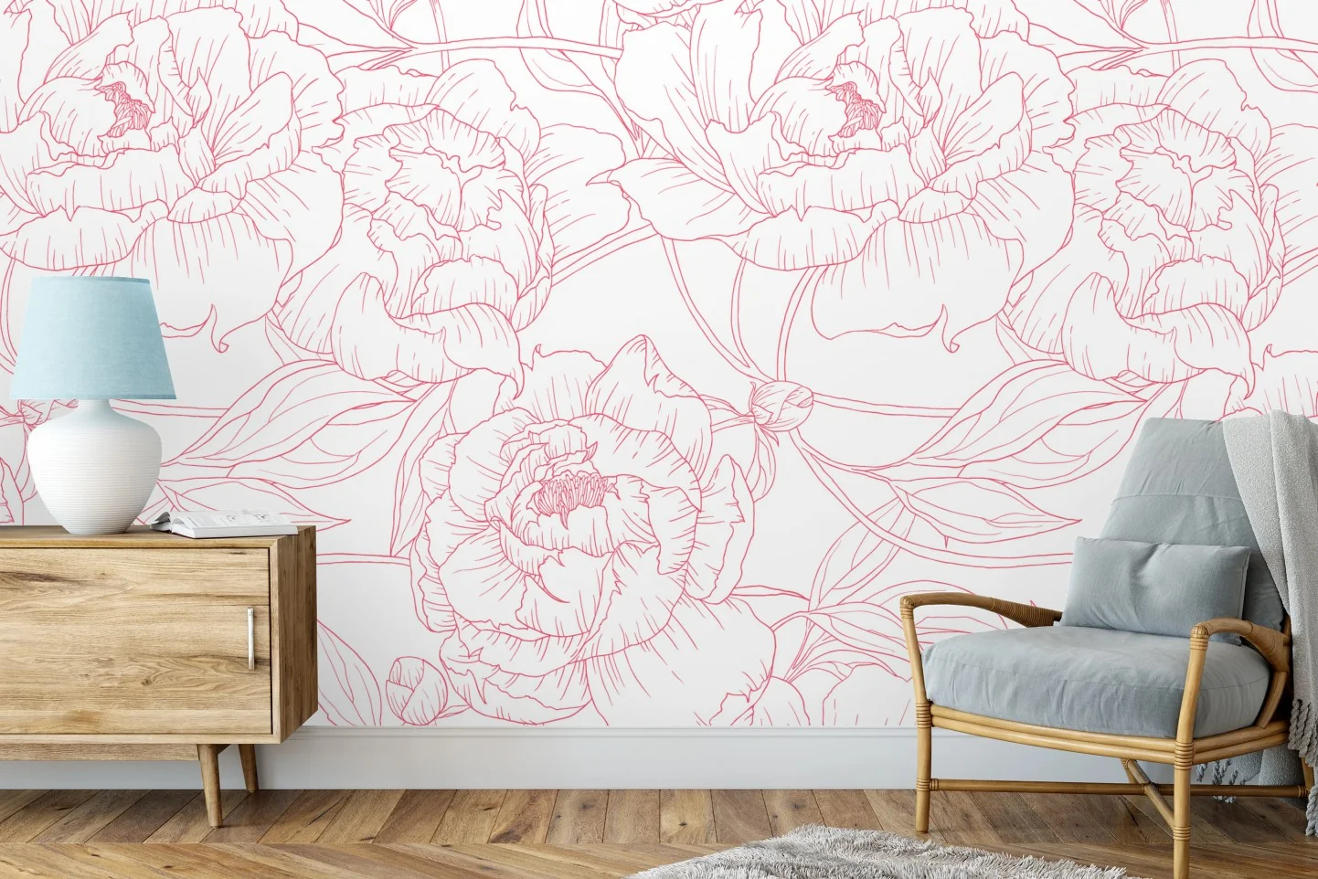 Fototapete Zartes rosa paeonien-line-art-muster