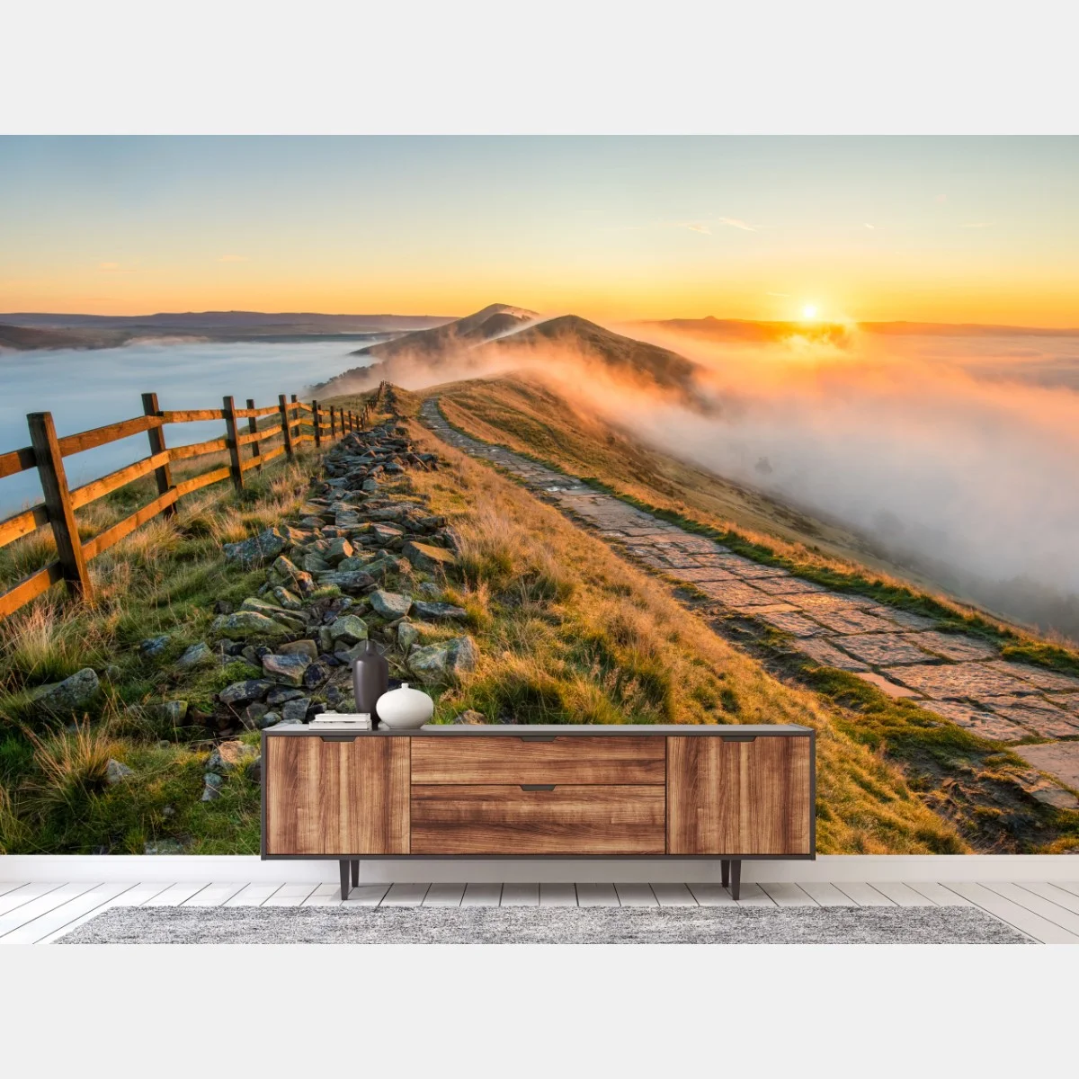 Fototapete Sonnenaufgang über einem nebligen bergrücken mit steinweg