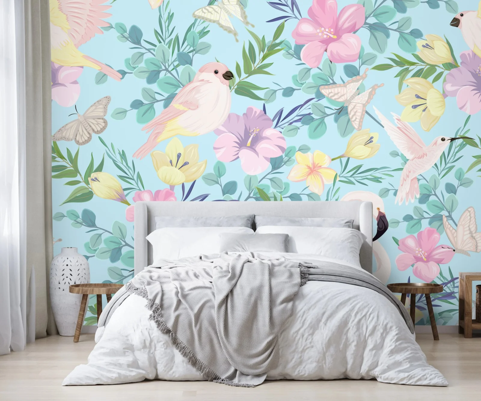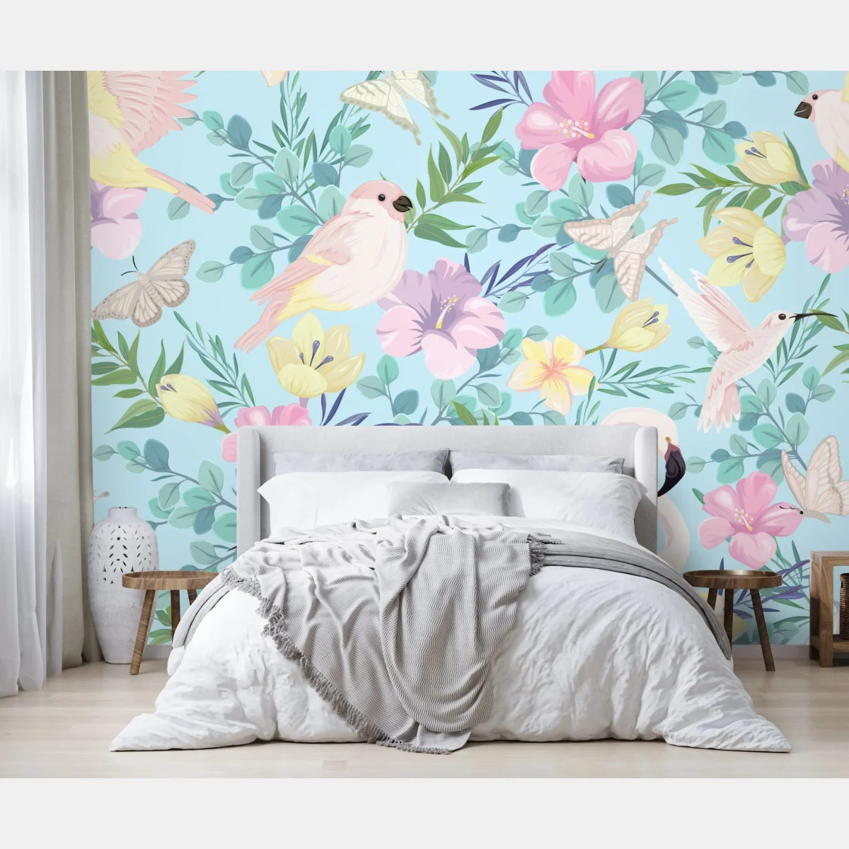 Fototapete Pastell tropisches vögel- und blumenmuster