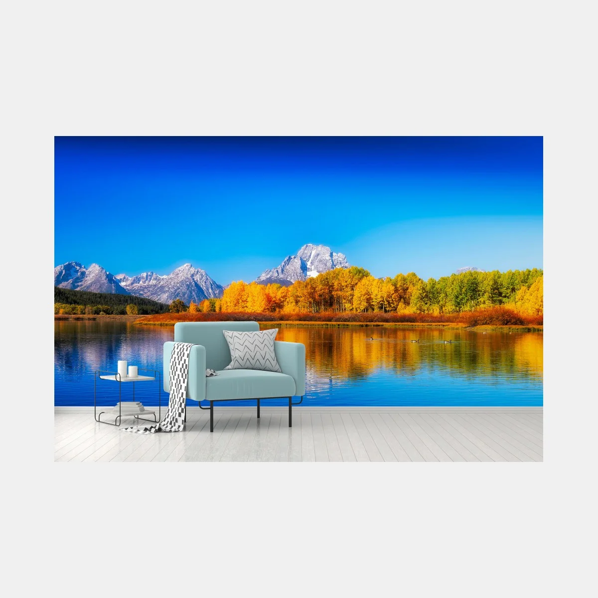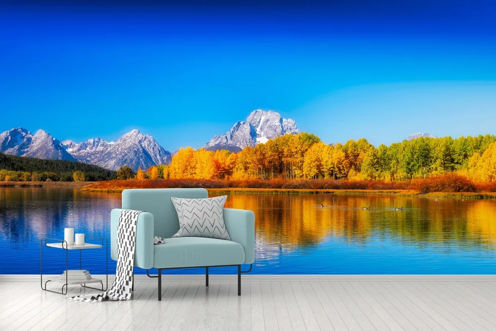 Atemberaubendes herbstliches Panorama mit goldenen Bäumen, ruhigen Seenreflexionen und schneebedeckten Gipfeln, das Ruhe und natürliche Schönheit in jeden Raum bringt.MehrWeniger
