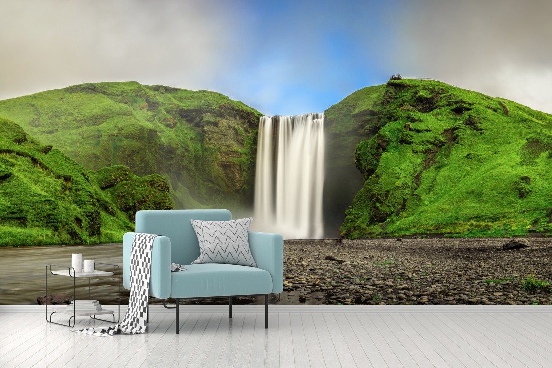 - reisen, natur, panorama, fluss, landschaft, island, wasserfall, langzeitbelichtung, grüne hügel, skogafoss