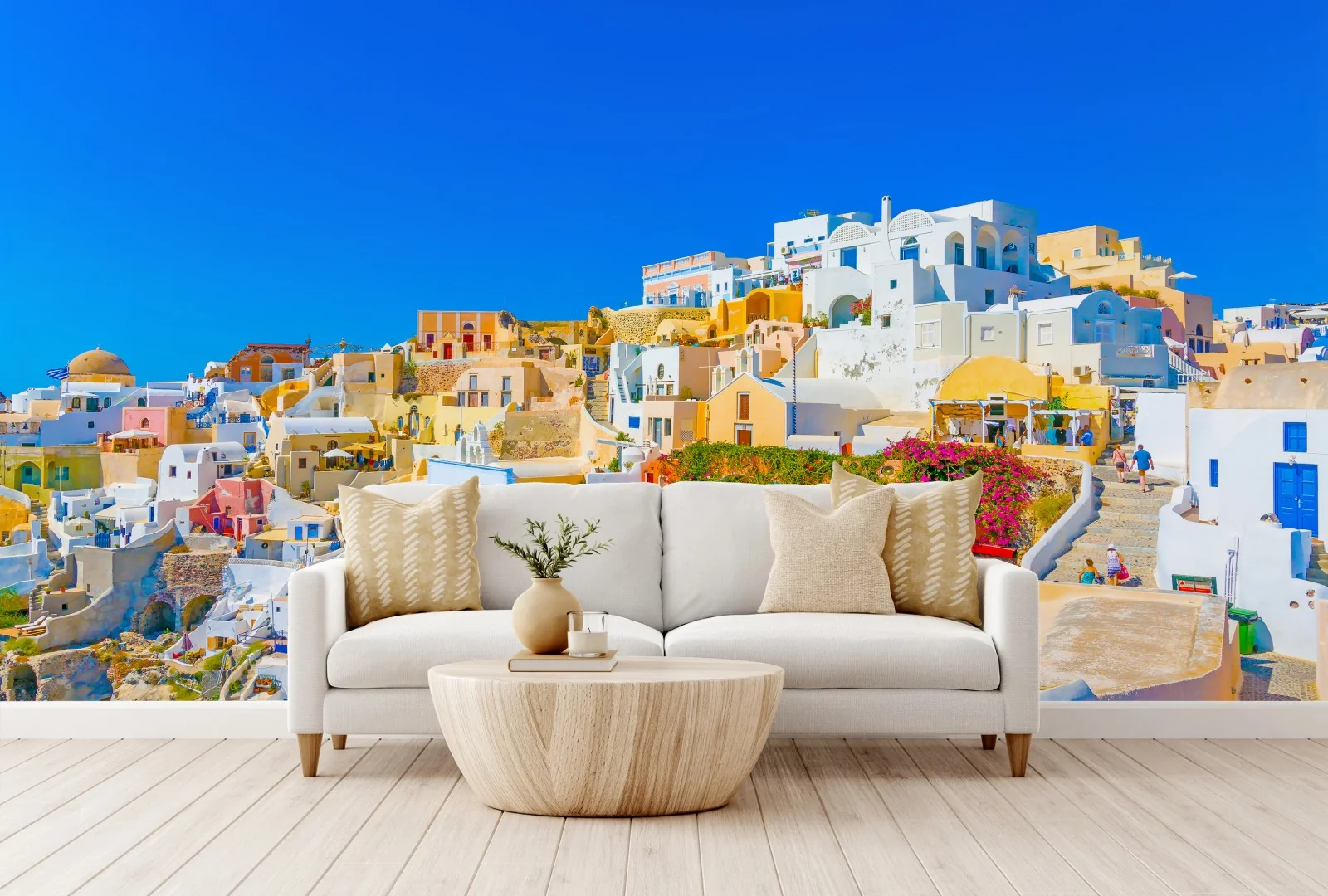 Lebendige Ansicht der weiß getünchten Häuser von Oia vor dem strahlend blauen Himmel bringt mediterranen Charme und Ruhe in jeden Raum.MehrWeniger