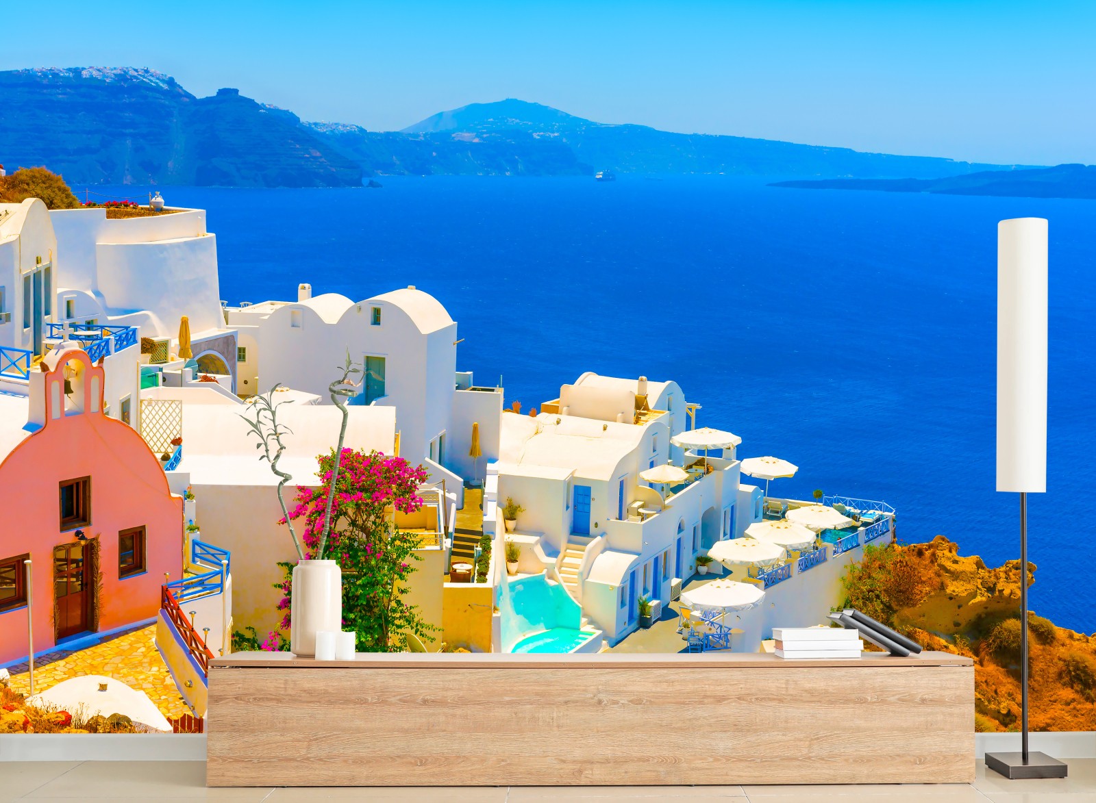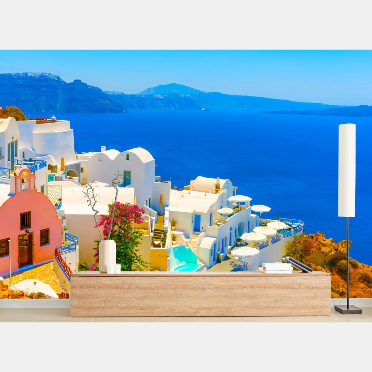 Fototapete Sonniger blick auf Santorini mit weißen häusern und blauem meer