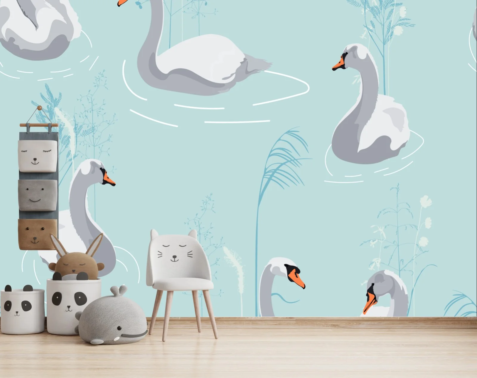 - illustration, türkis, kinderzimmer, pastell, muster, vögel, schwan, teich, dekoration, schwäne