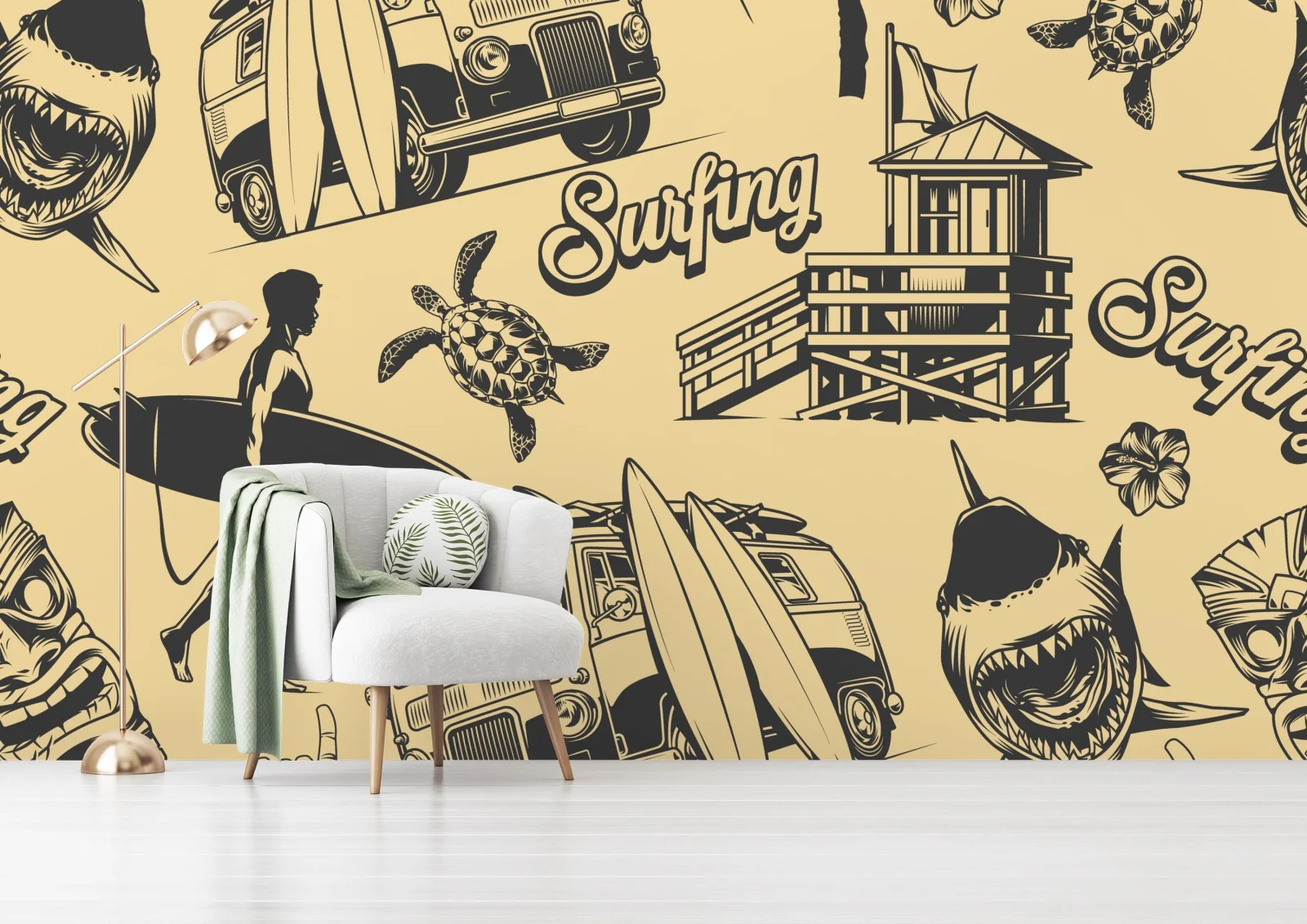 - strand, palmen, surfen, maritim, muster, retro, campingbus, surfbrett, hai, meeresschildkröte