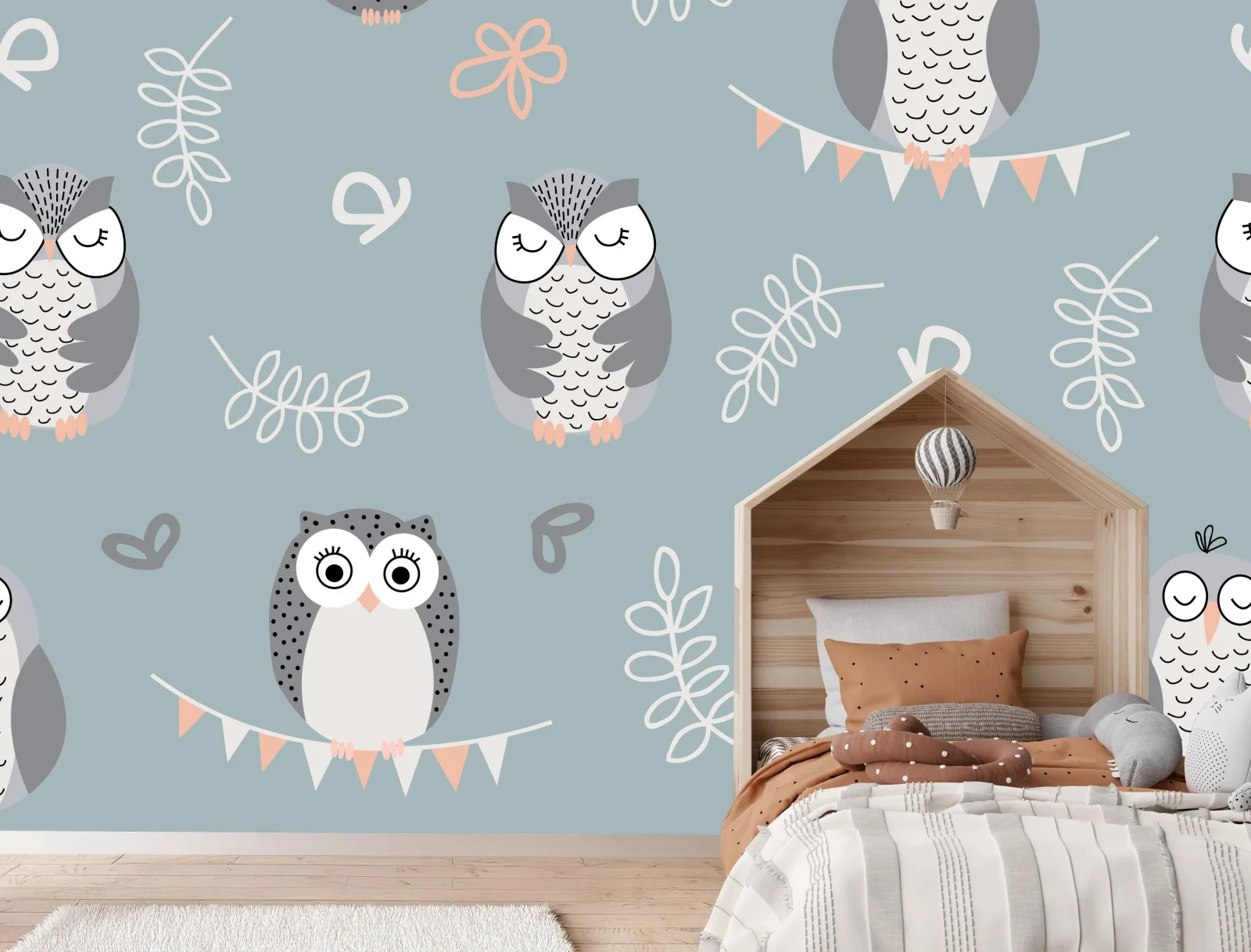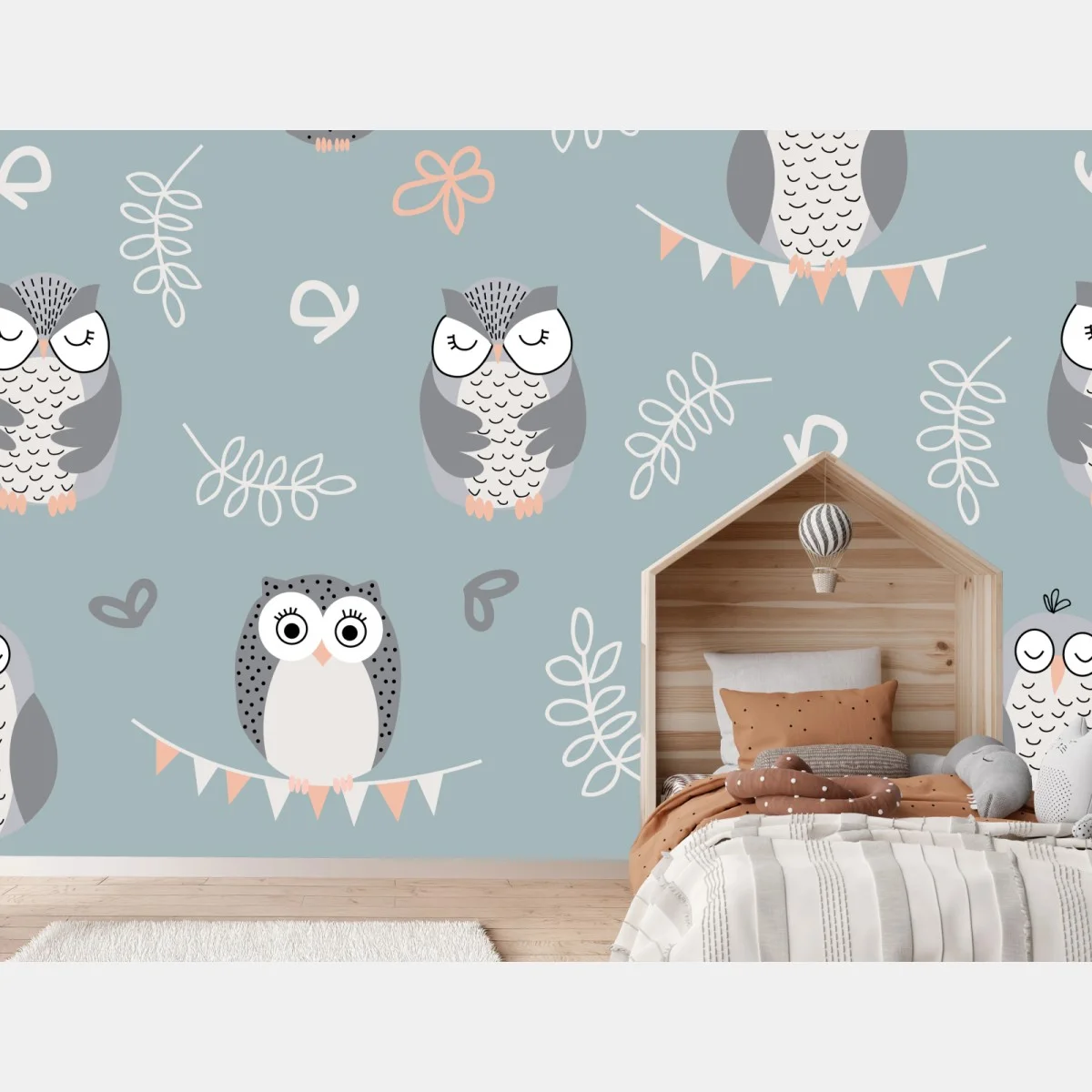 - illustration, kinderzimmer, pastell, skandinavisch, dekoration, niedlich, waldtiere, blauer hintergrund, eulen, eulenmuster