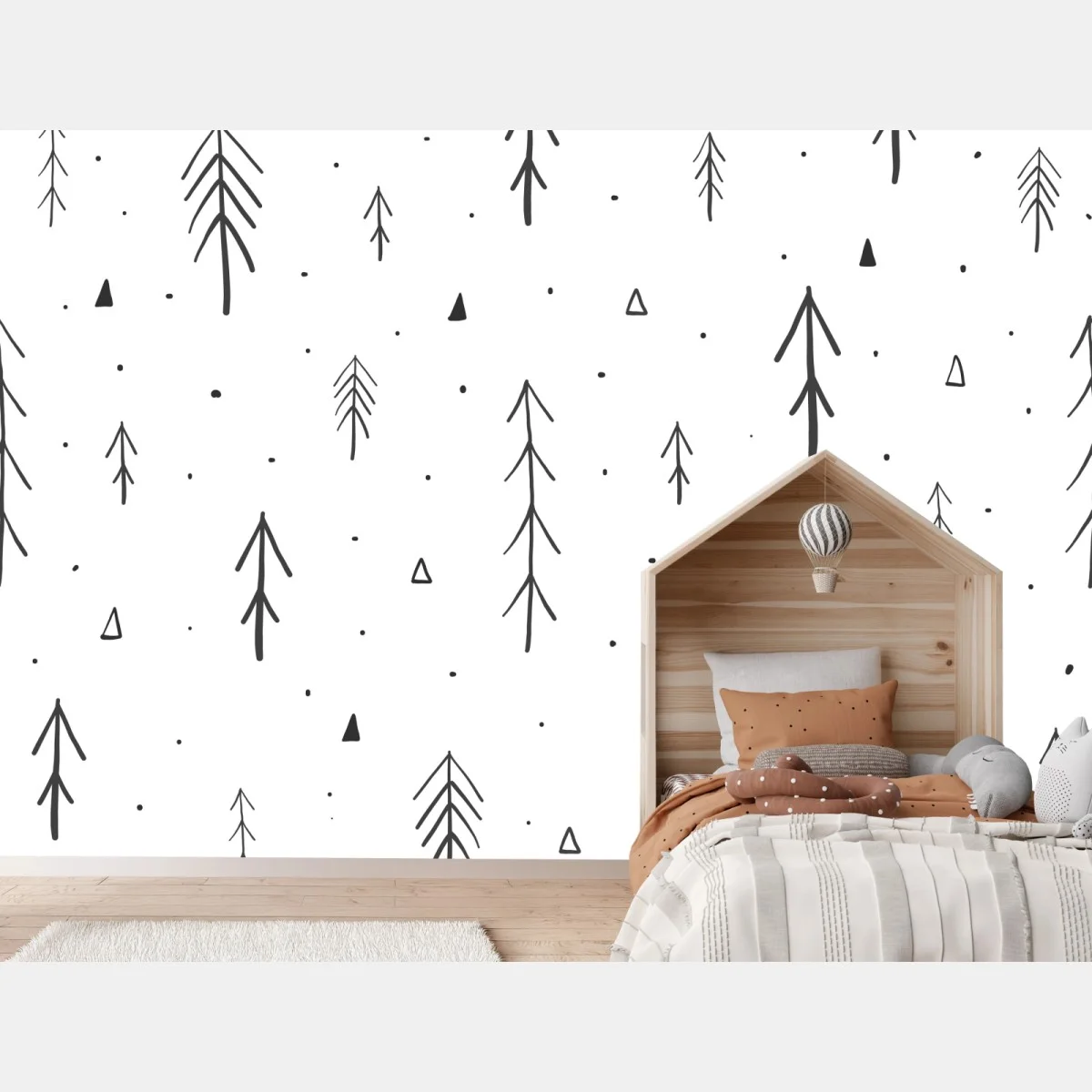 - minimalistisch, kinderzimmer, modern, wald, bäume, muster, monochrom, nahtlos, skandinavisch, handgezeichnet