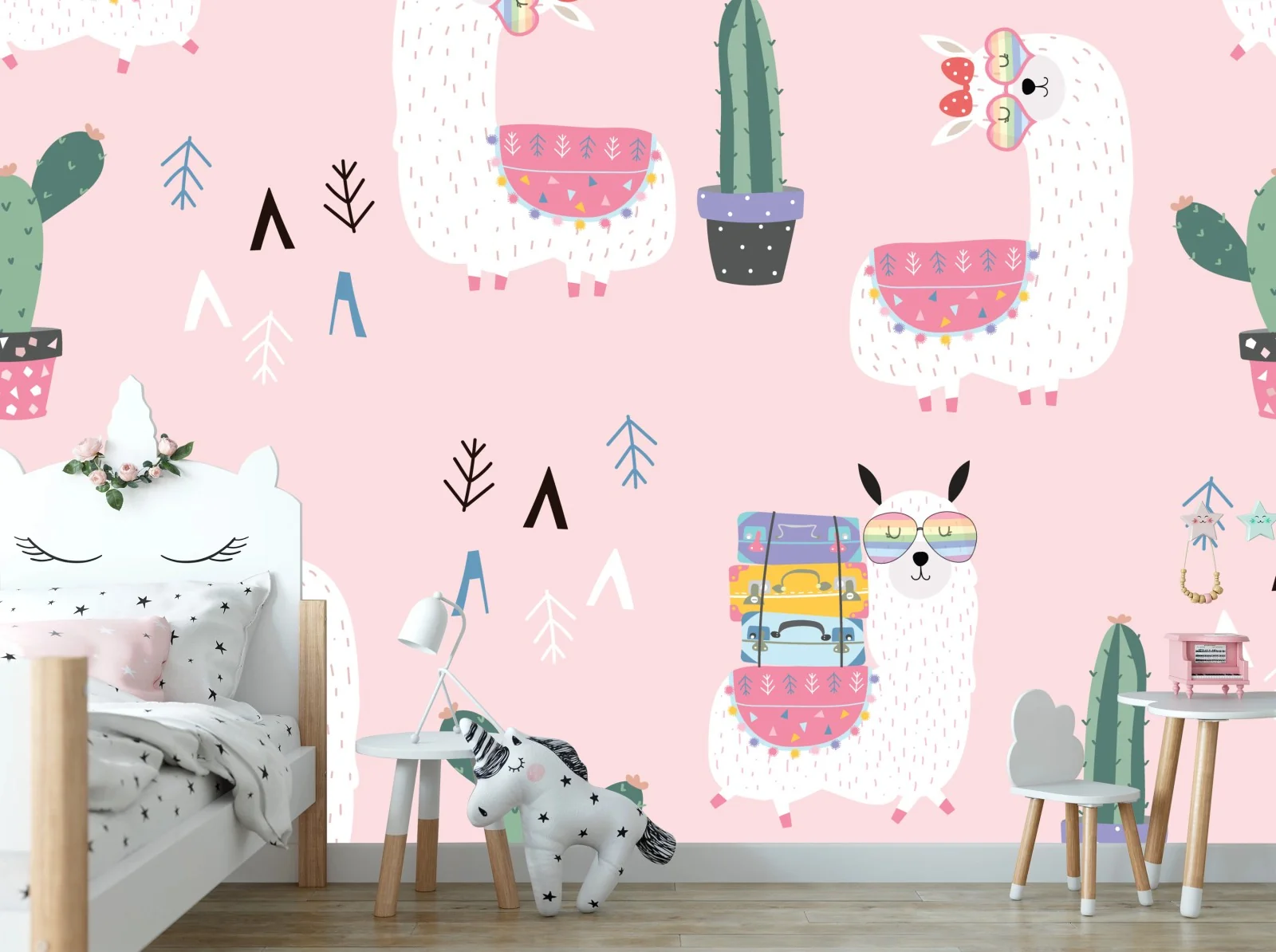 sanfte pastell-lamas und kakteen bilden ein verspieltes boho-muster, das jedes kinderzimmer aufhellt.MehrWeniger