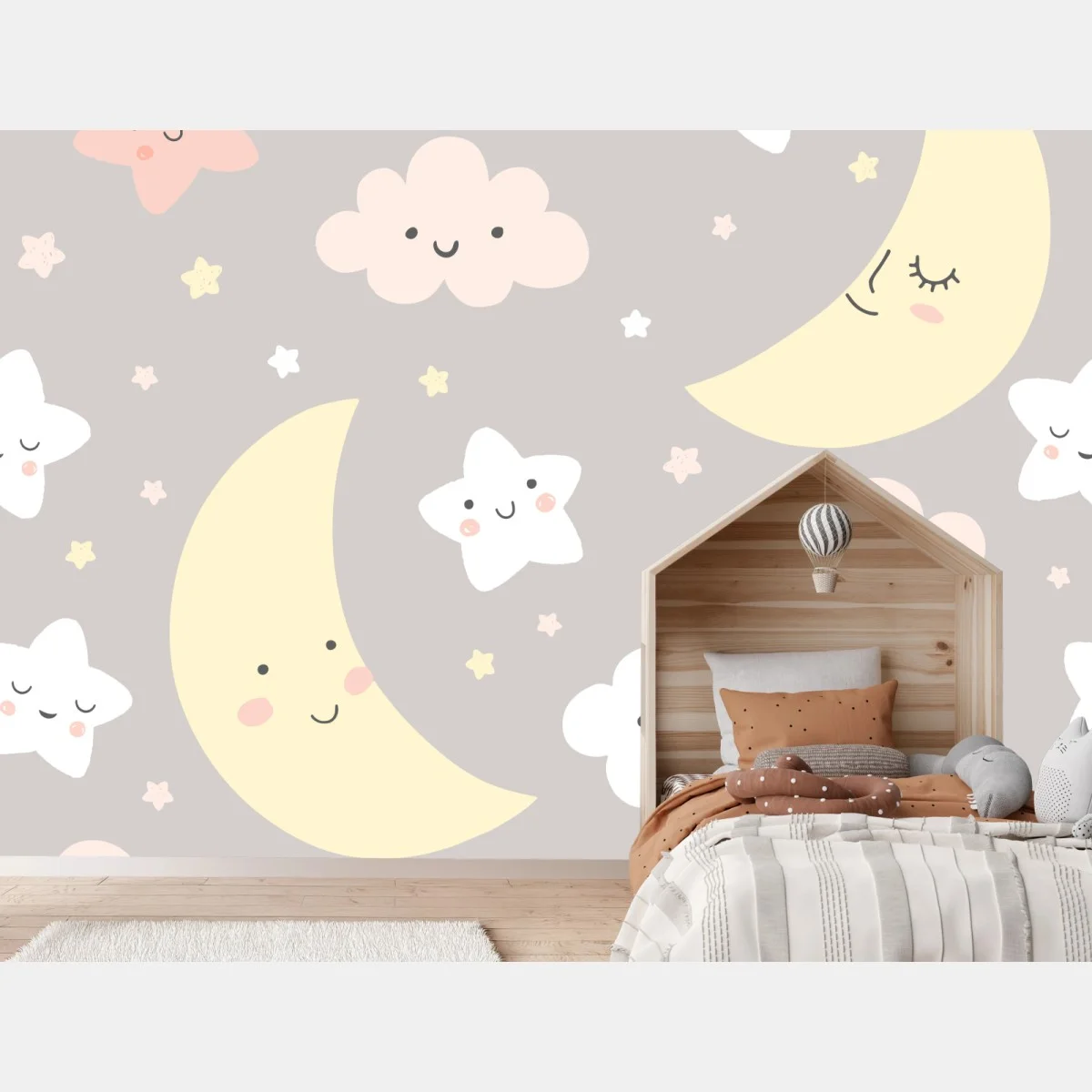 Zarte Pastellmonde, Sterne und lächelnde Wolken schaffen ein beruhigendes Motiv, das jedem Kinderzimmer Charme verleiht.MehrWeniger