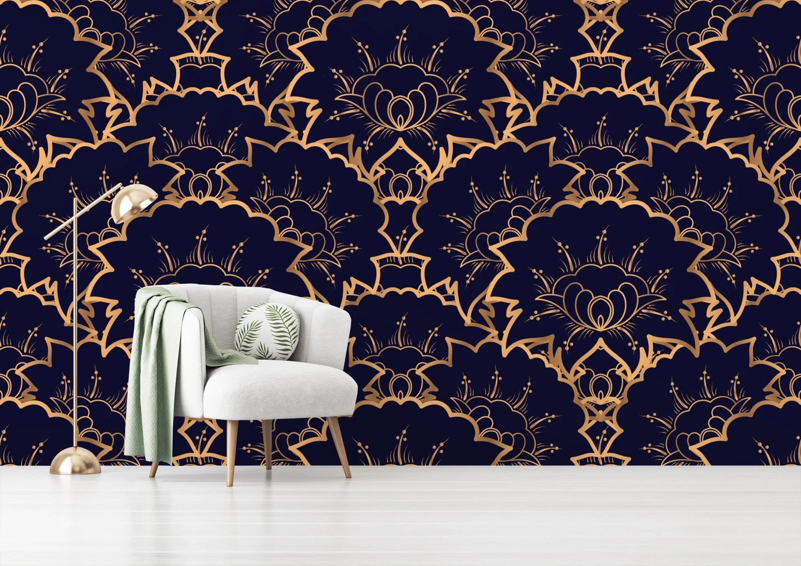 Fototapete Luxuriöses goldenes blütenmuster auf marineblau