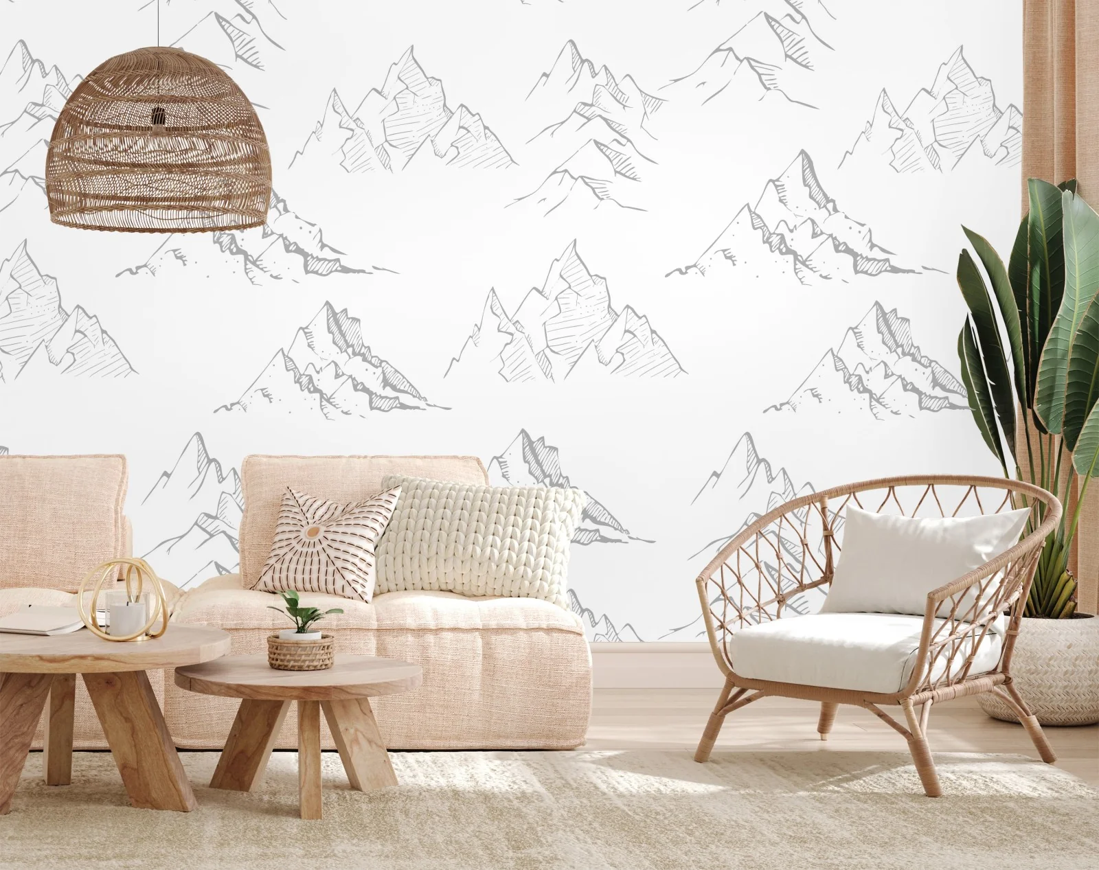 zarte handgezeichnete bergskizzen in einem nahtlosen monochromen muster verleihen jedem raum eine ruhige, minimalistische atmosphäre.MehrWeniger