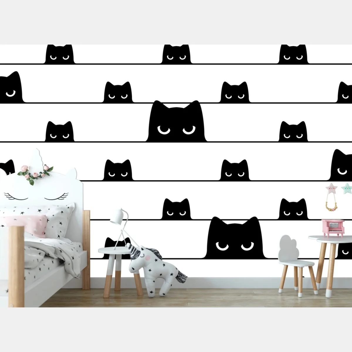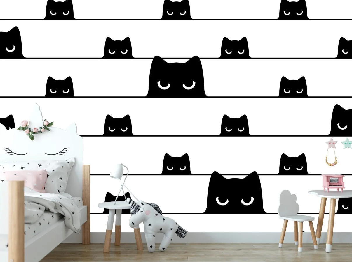 - minimalistisch, kinderzimmer, muster, schwarzweiß, silhouette, niedlich, katze, wiederholend, katzen, verschmitzt