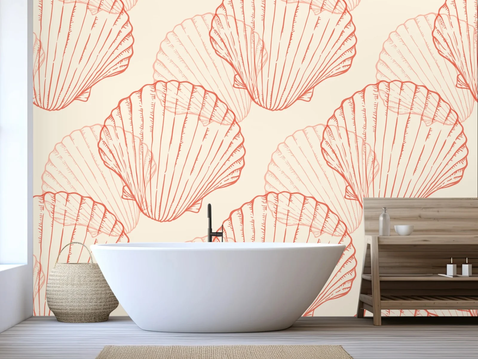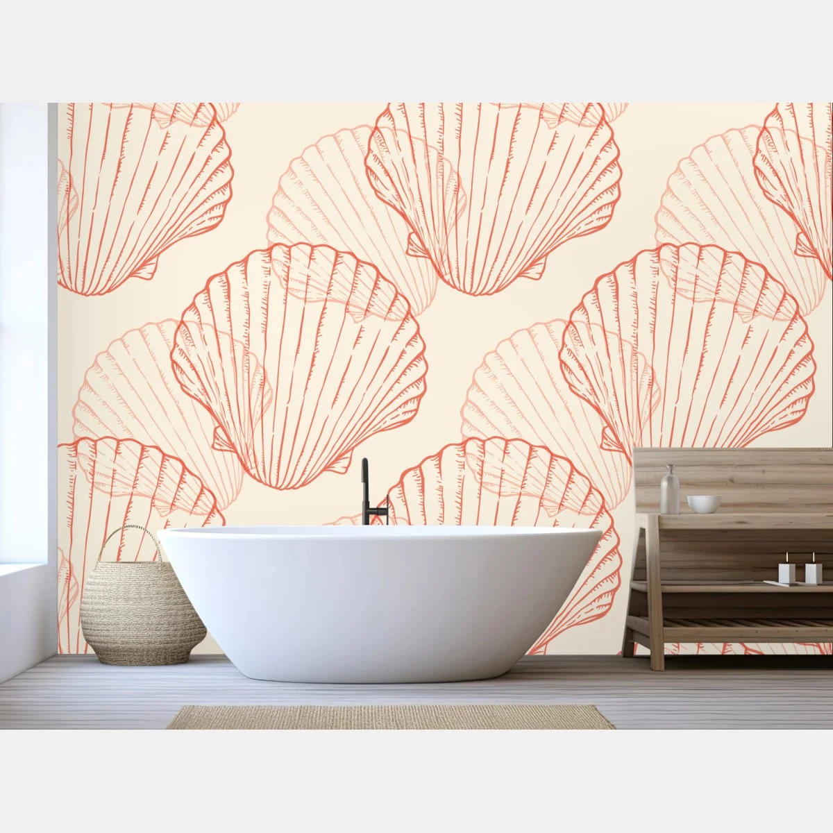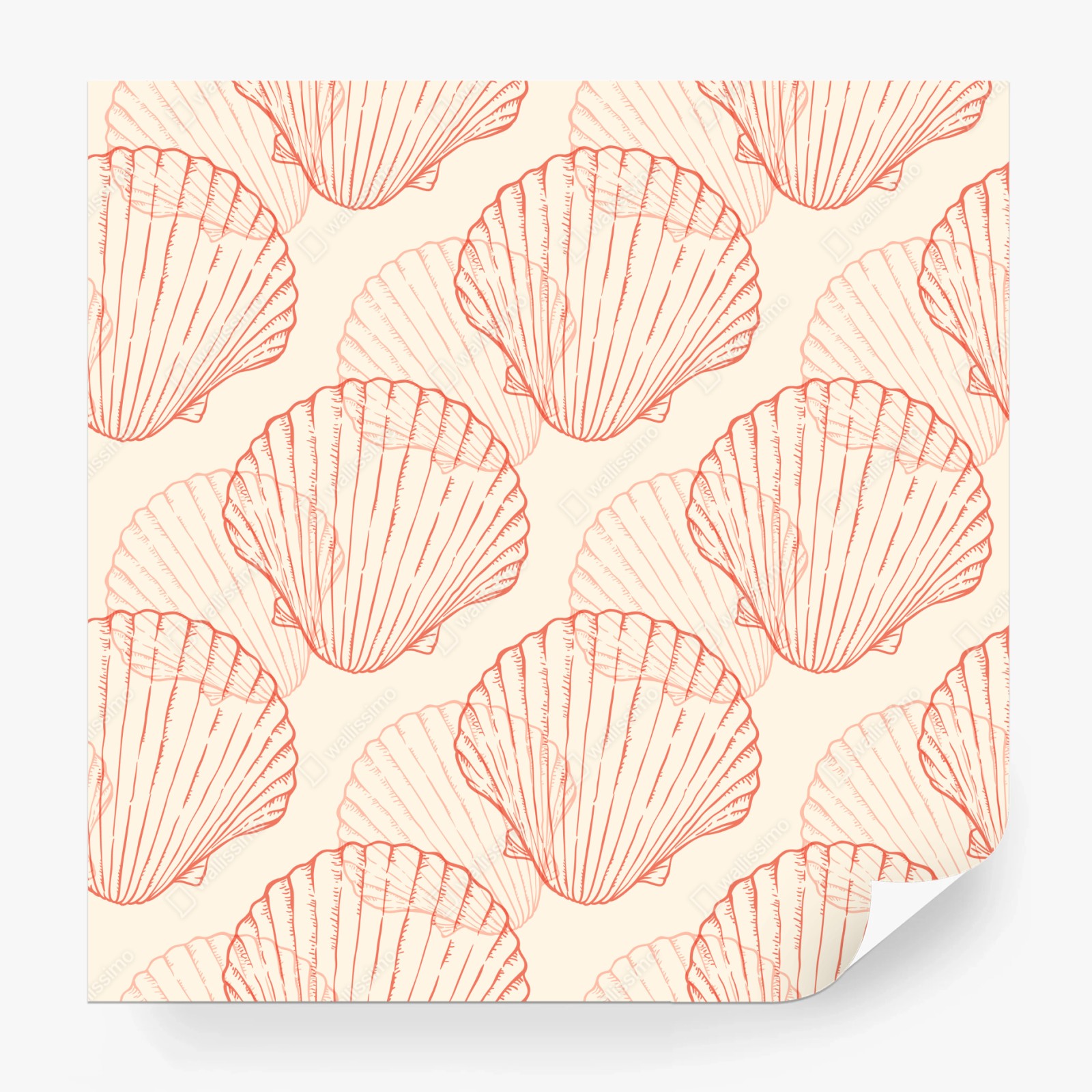Zarte korallenfarbene Jakobsmuscheln auf warmem beigen Hintergrund schaffen ein beruhigendes maritimes Muster ideal für Badezimmer oder Stranddekor.MehrWeniger