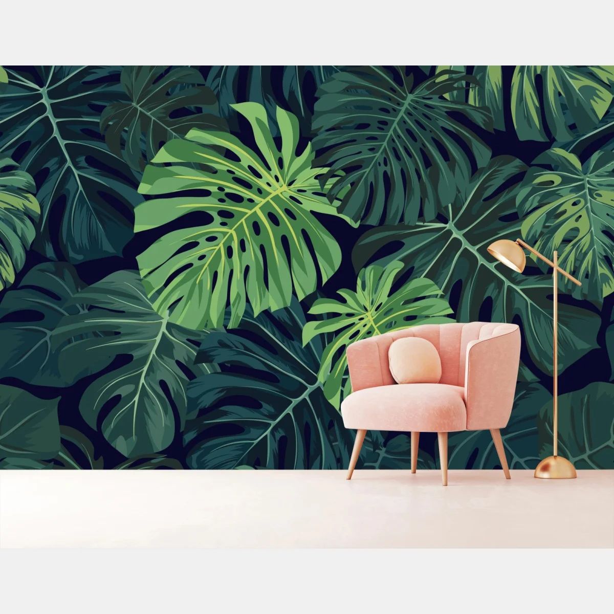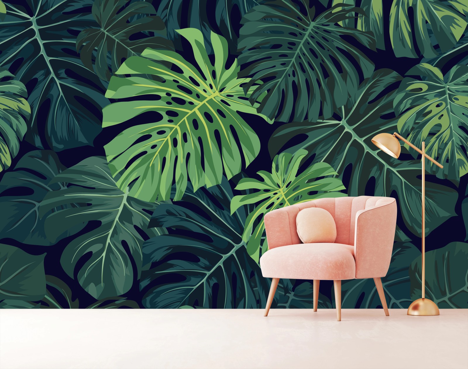 Üppiges Muster aus Monstera-Blättern bringt leuchtendes Grün und natürliche Atmosphäre in jeden Raum und eignet sich ideal als biophiles Highlight.MehrWeniger
