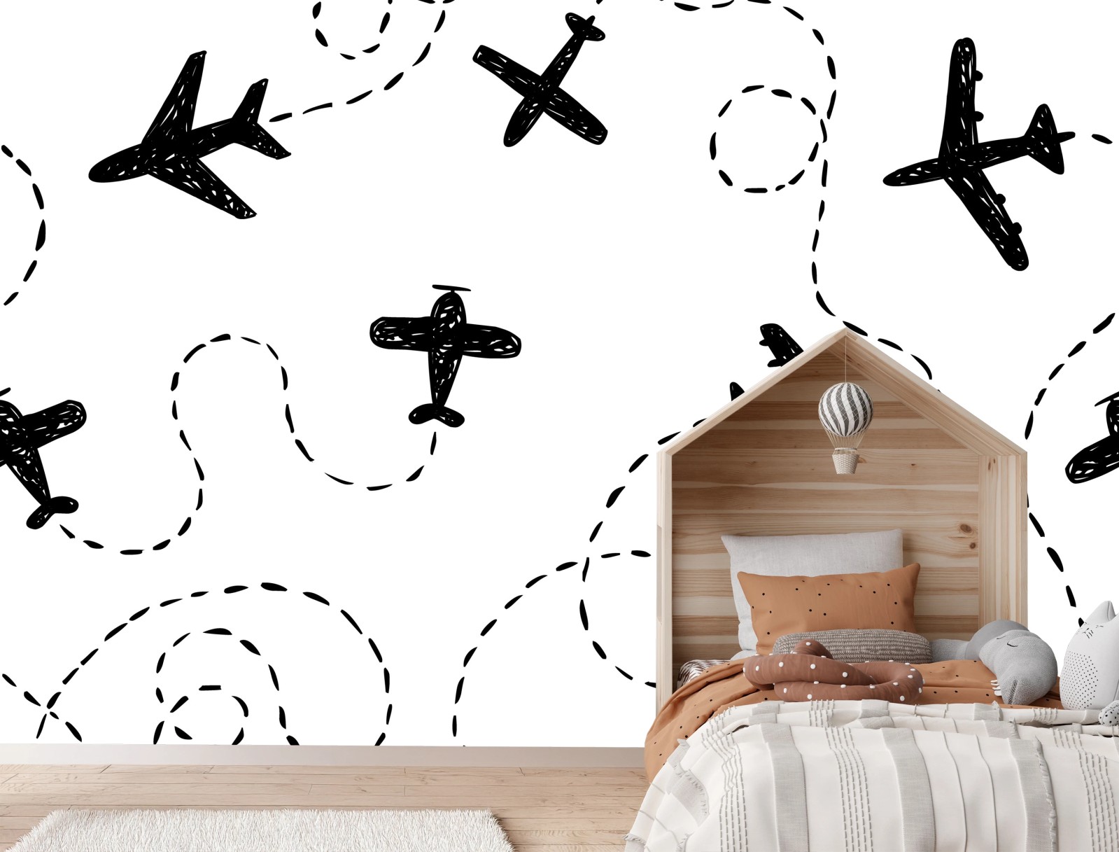 - kinderzimmer, reisen, kinder, muster, tapete, nahtlos, schwarzweiß, luftfahrt, flugzeuge, doodle
