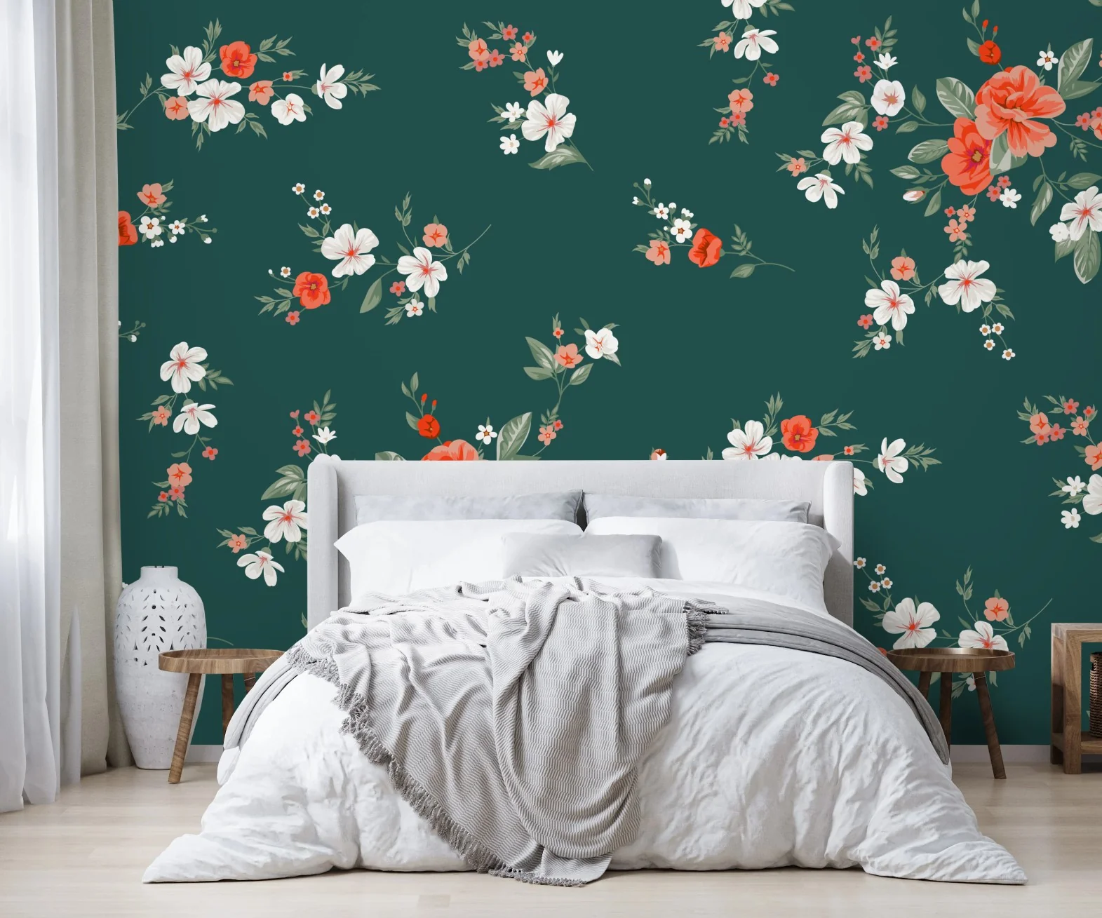 Fototapete Vintage korallenblumenmuster auf tiefgrünem hintergrund