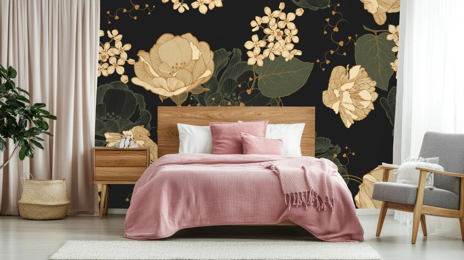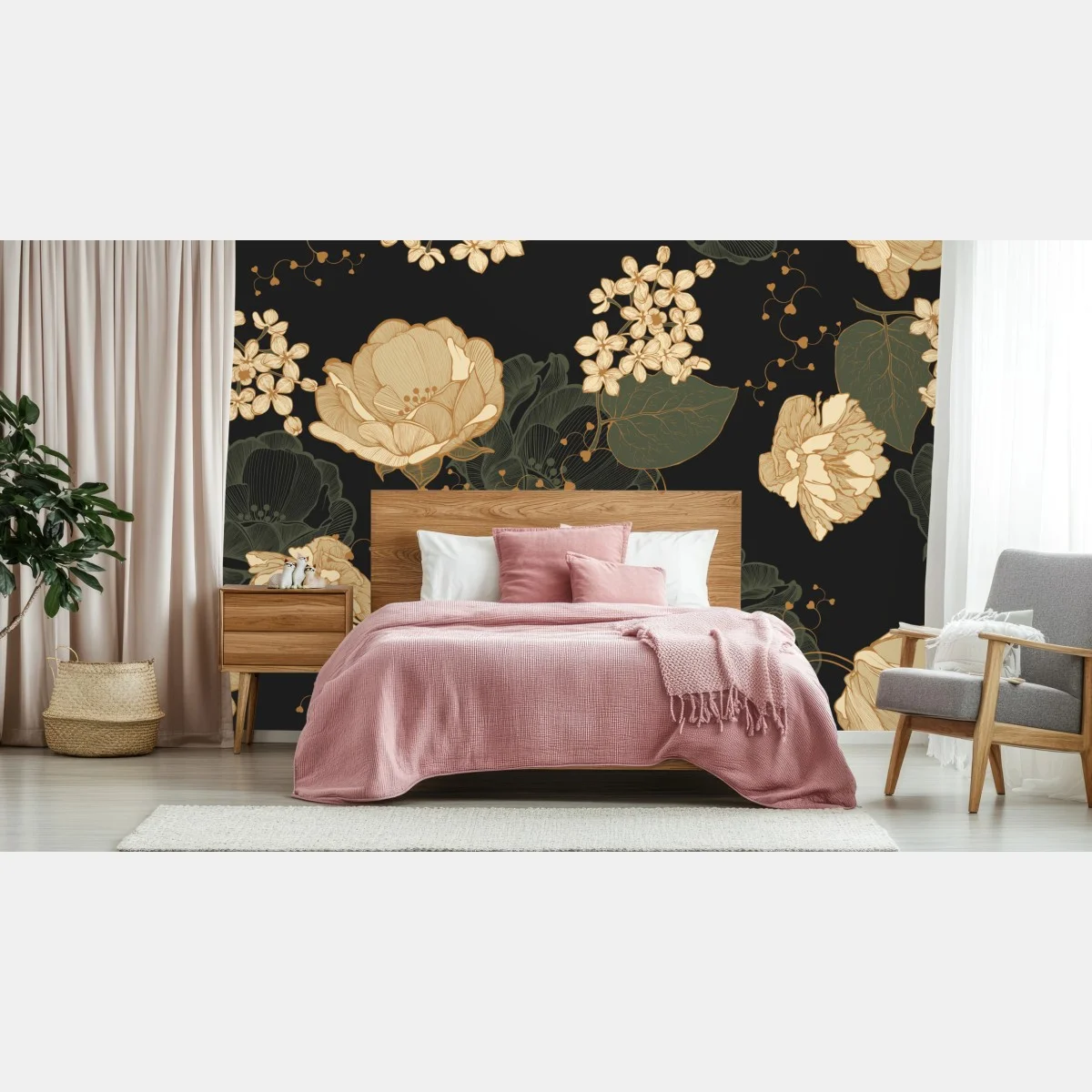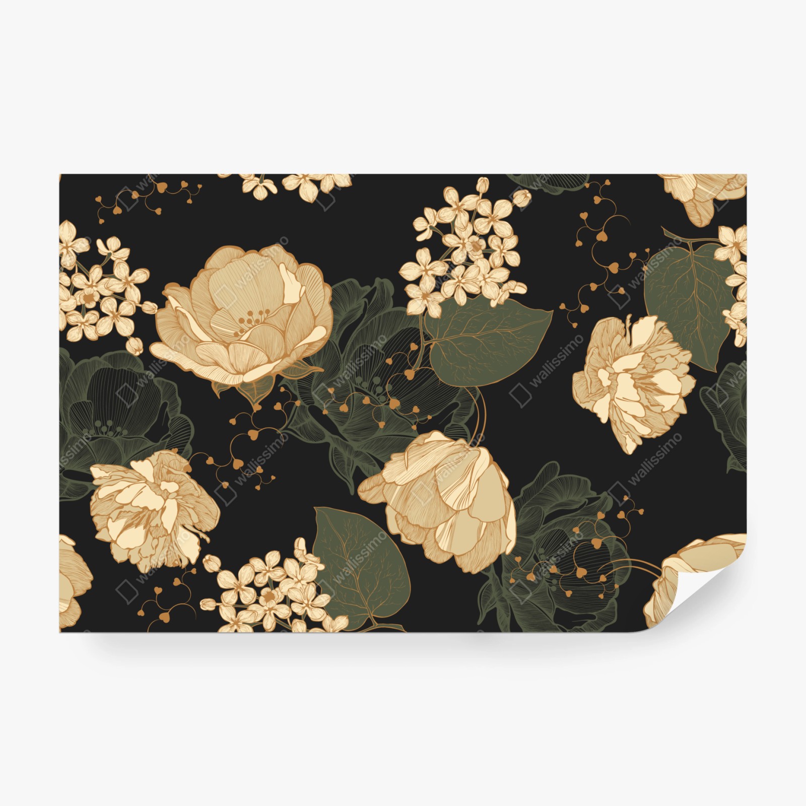 - vintage, blumenmuster, wandkunst, elegantes design, dunkler hintergrund, botanischer druck, goldene blüten, nahtloses tapetenmuster, pfingstrose, dekorative blätter