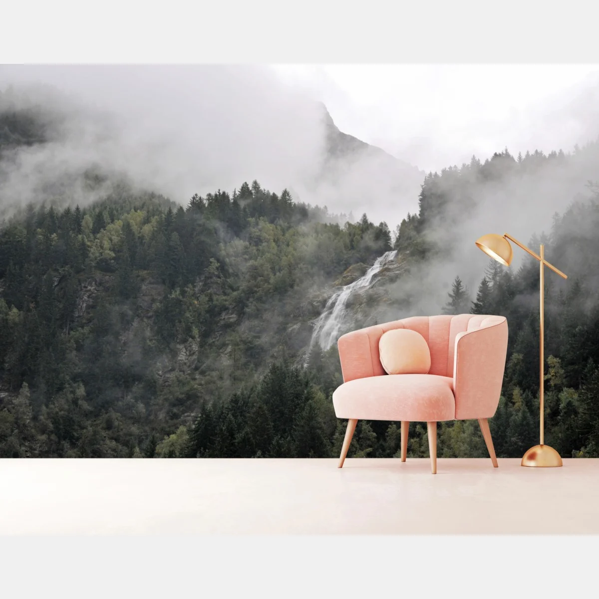 Fototapete Nebliger wasserfall im bergwald