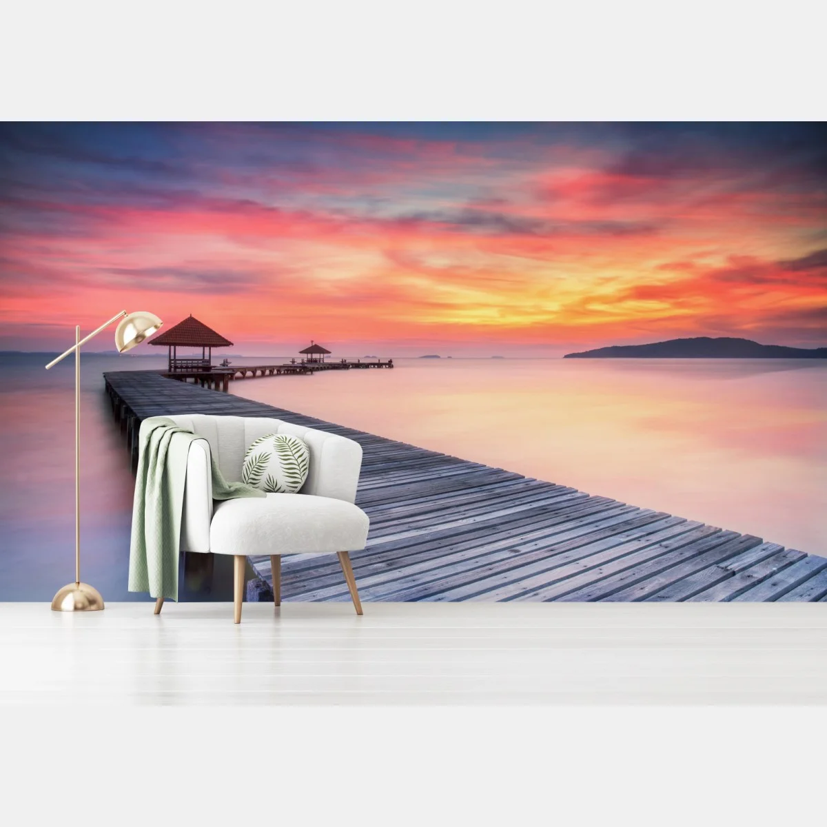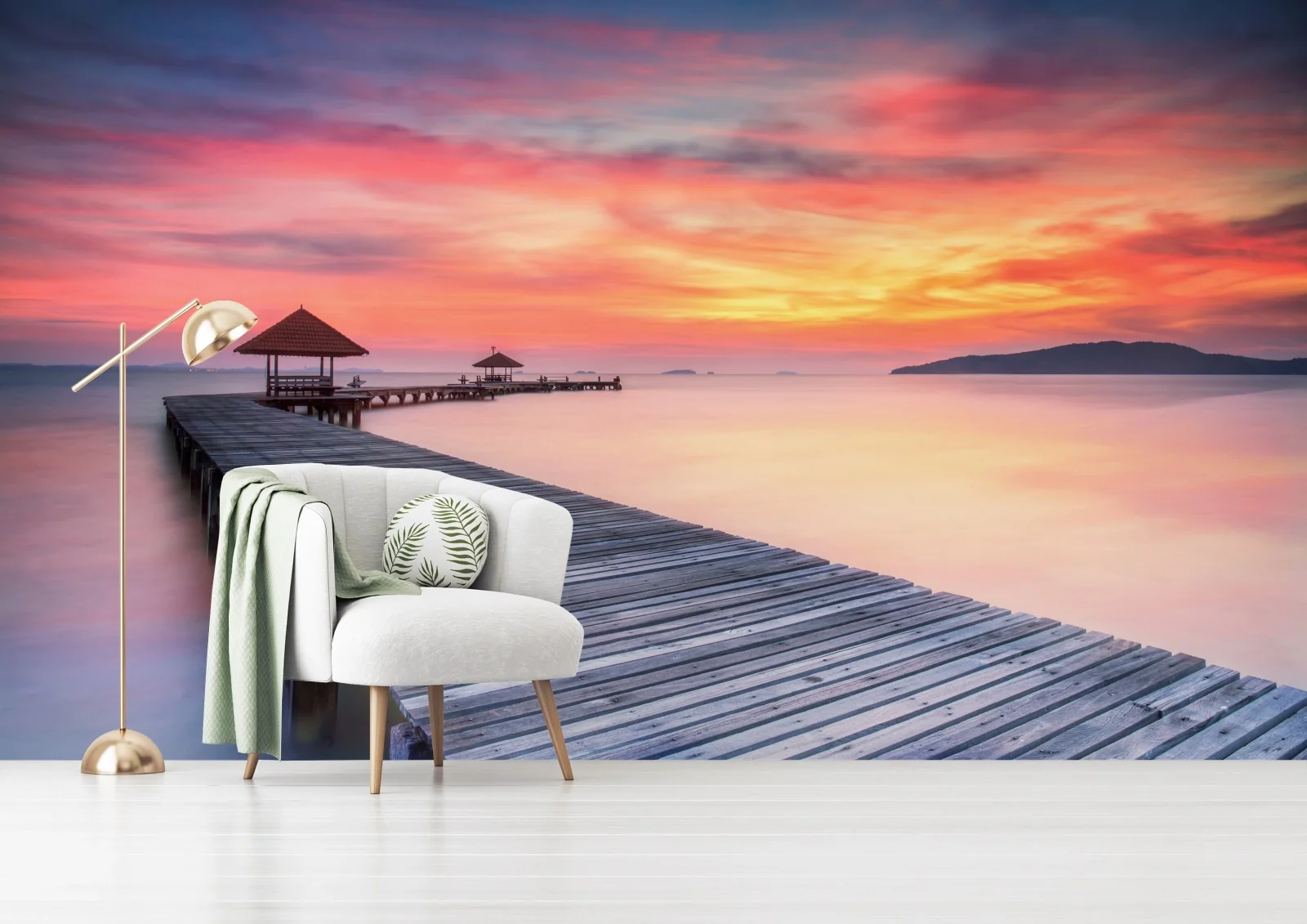Fototapete Ruhiger sonnenaufgang über hölzernem steg