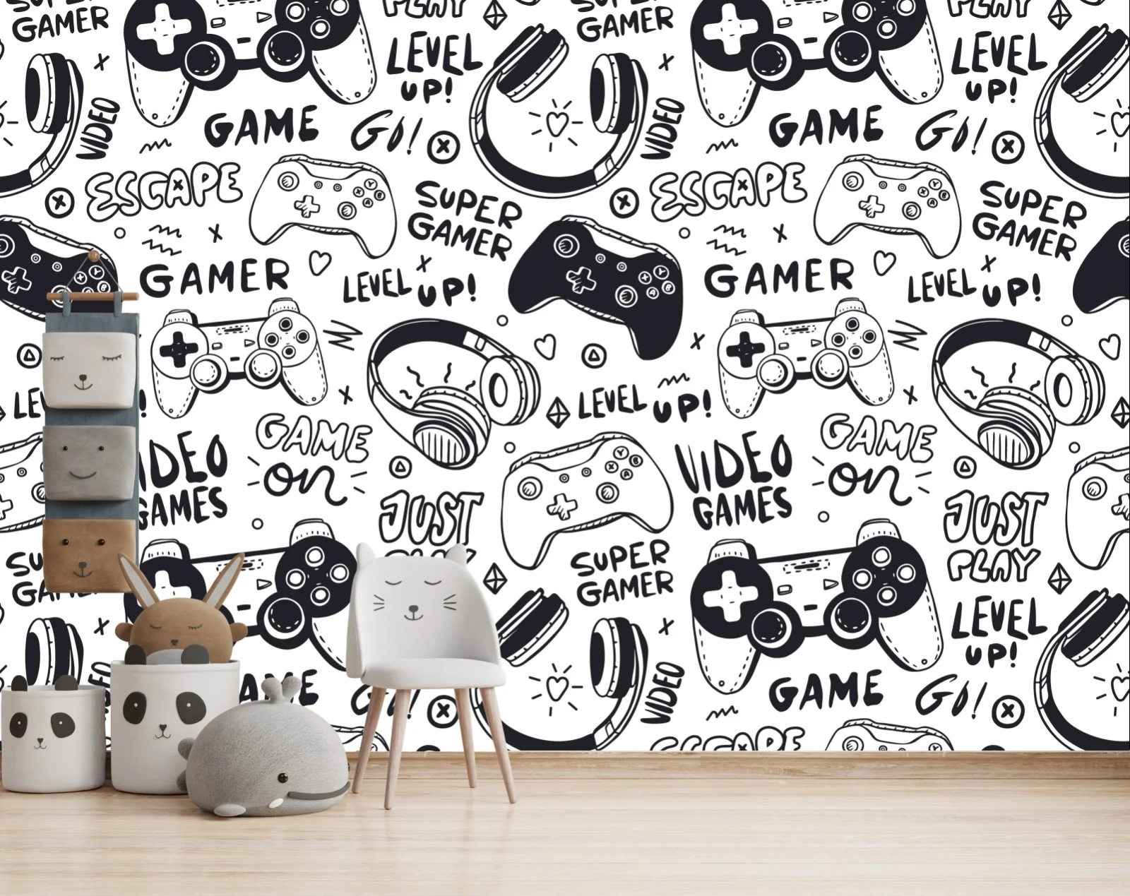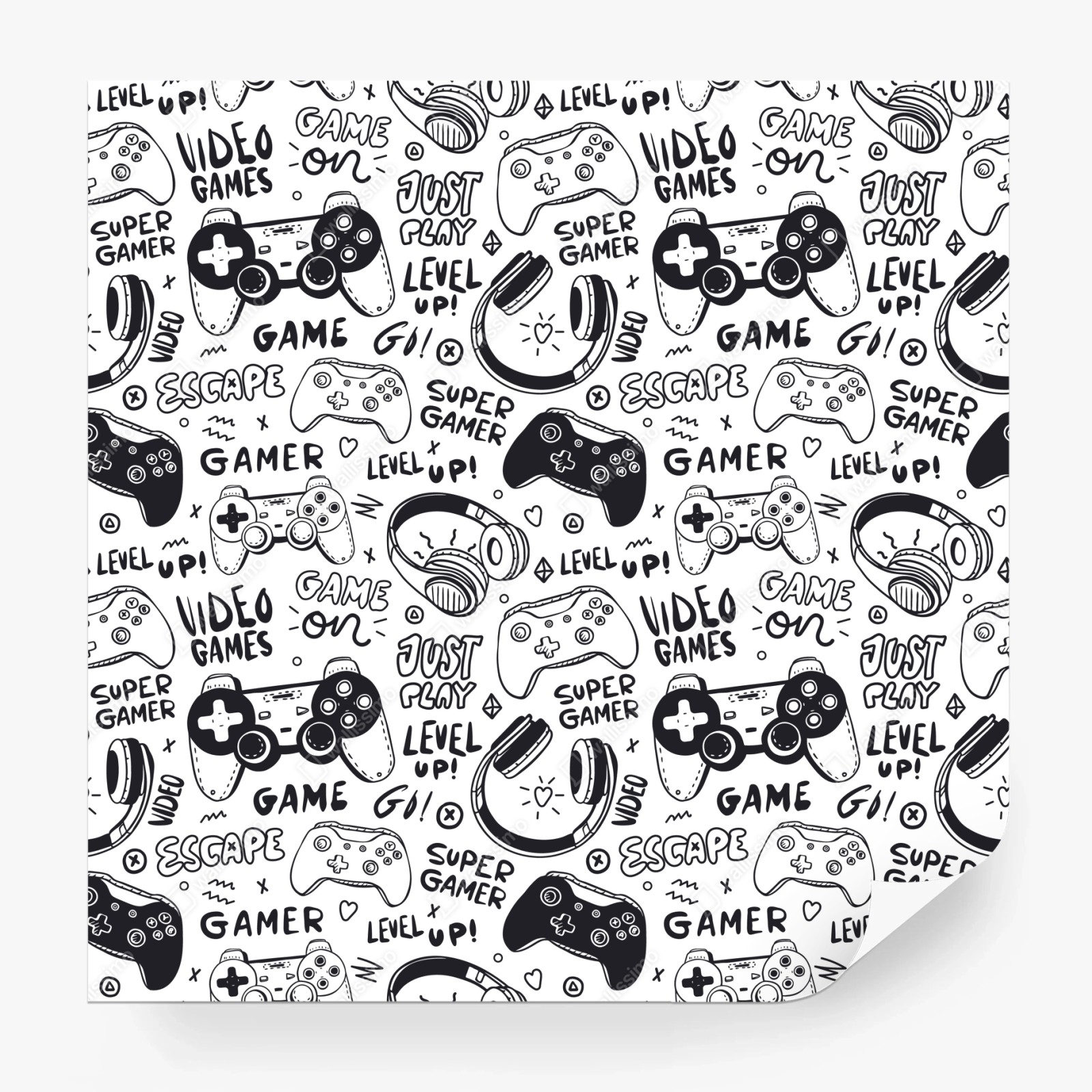 Kraftvolles schwarz-weißes Doodle-Muster mit Controllern und Kopfhörern, ideal für Spielzimmer und moderne Wohnakzente.MehrWeniger