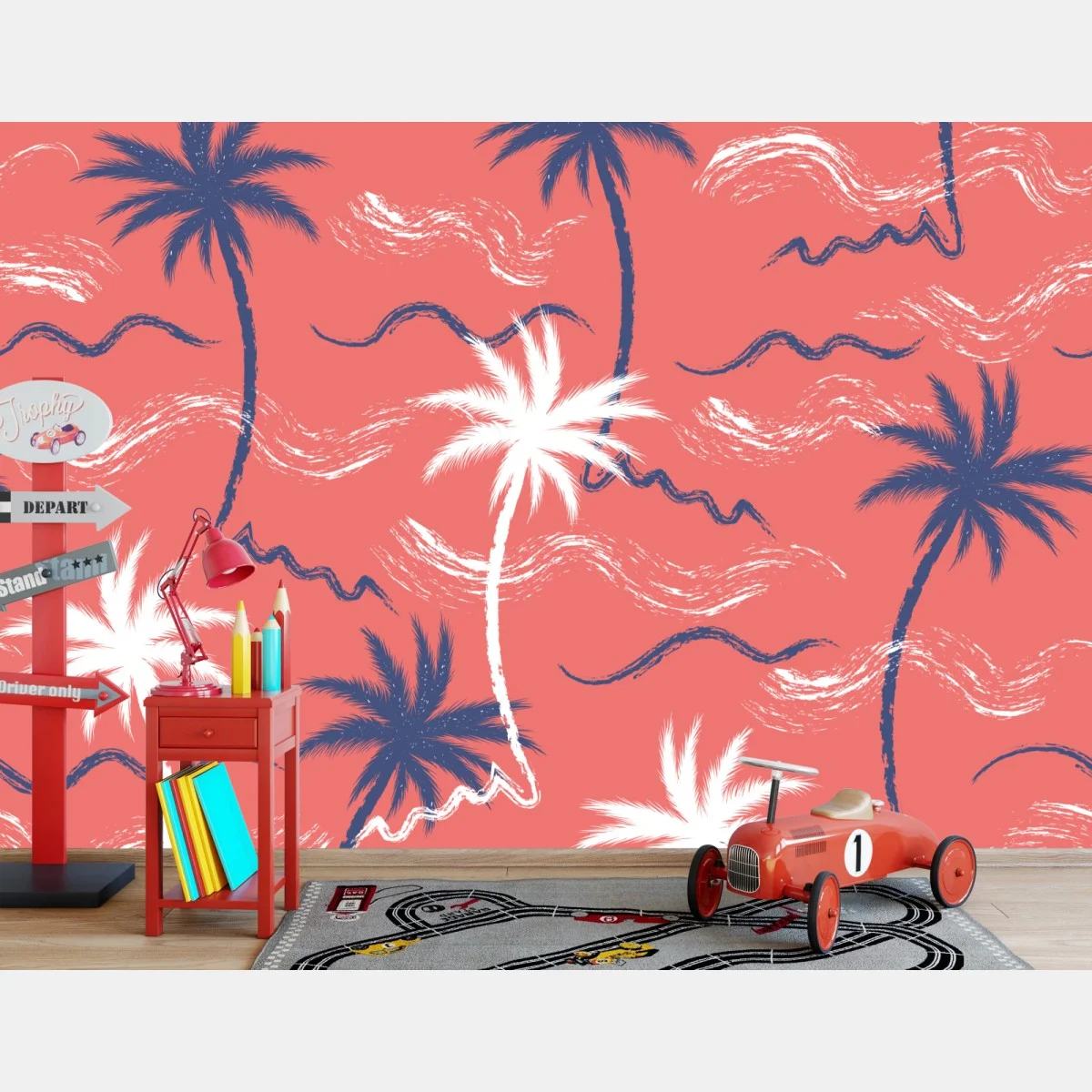 Fototapete Tropisches palmenmuster in koralle und dunkelblau