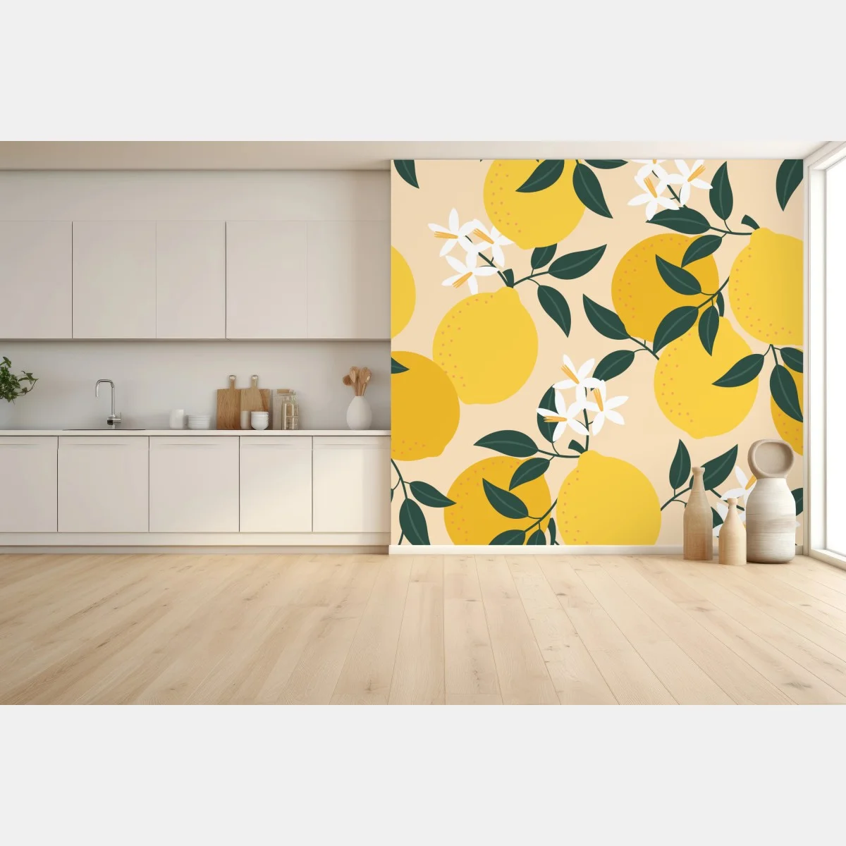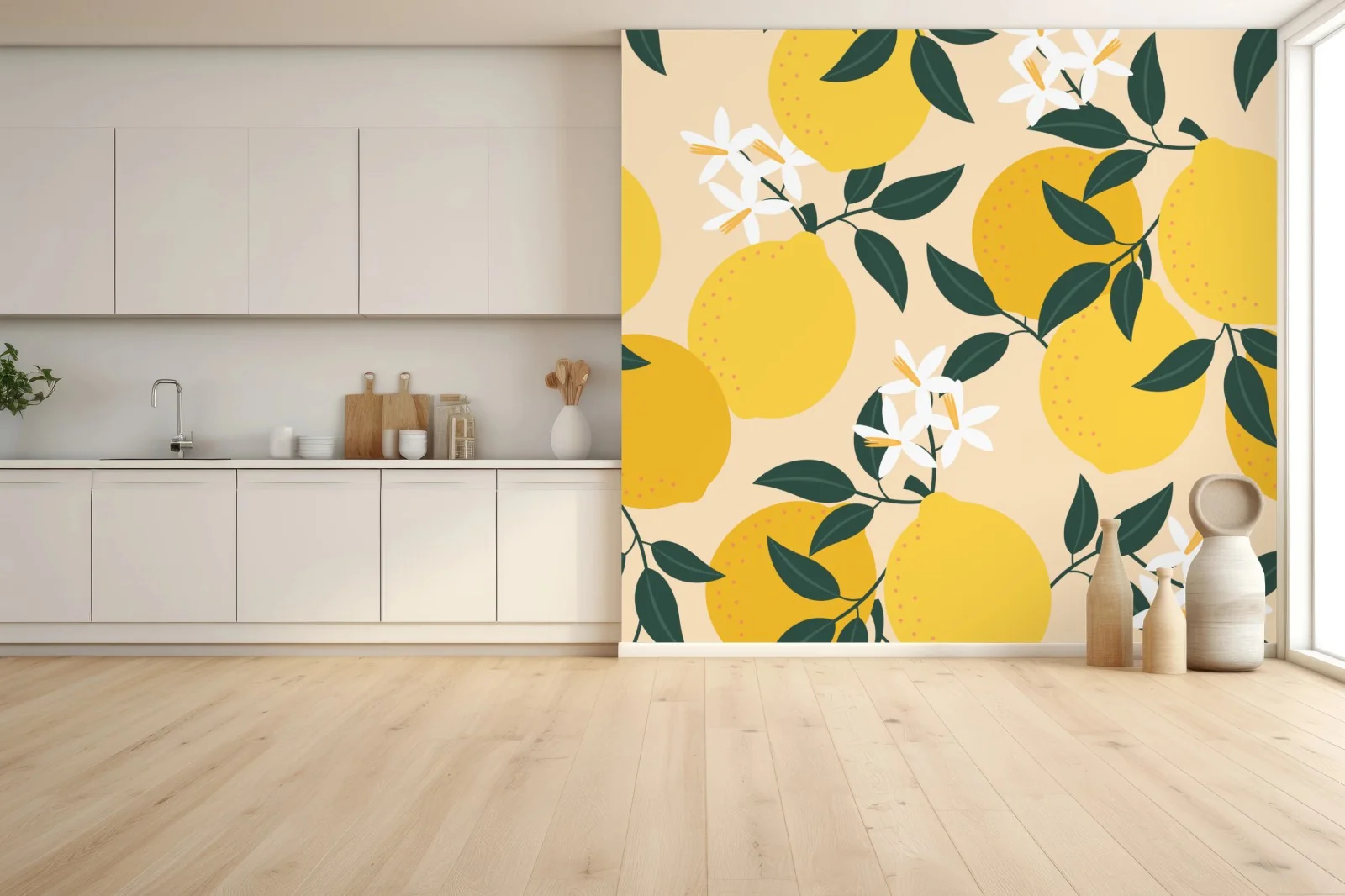 Fototapete Leuchtendes zitronenmuster mit blüten