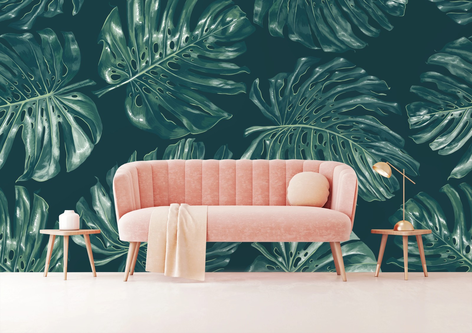 Üppige tropische Monstera-Blätter in einem handgemalten Aquarellmuster bringen beruhigendes Grün und natürliche Atmosphäre in jeden Raum.MehrWeniger