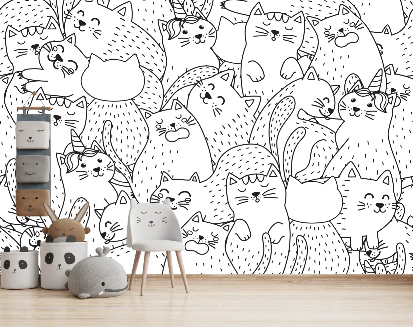 - illustration, muster, nahtlos, schwarz-weiß, niedlich, skizze, ausmalbild, kätzchen, katzen, kritzel