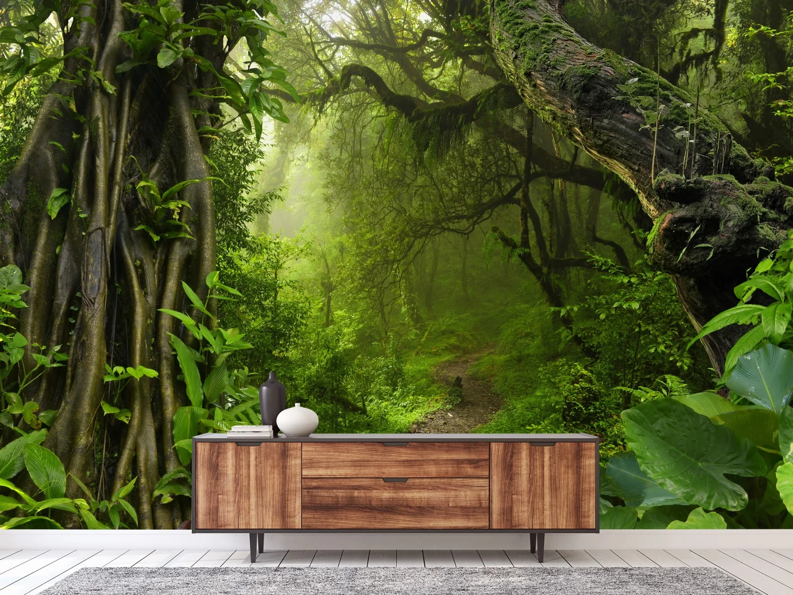 Fototapete Üppiger nebliger waldpfad