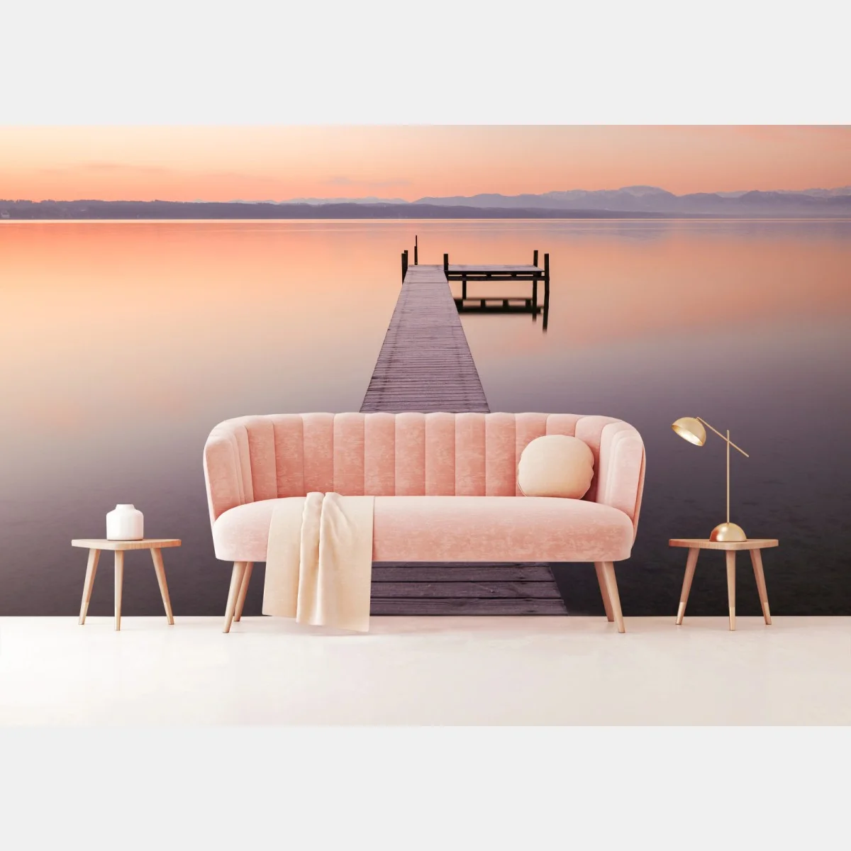 Fototapete Ruhiger steg im frühaufgang über pastellfarbenem see