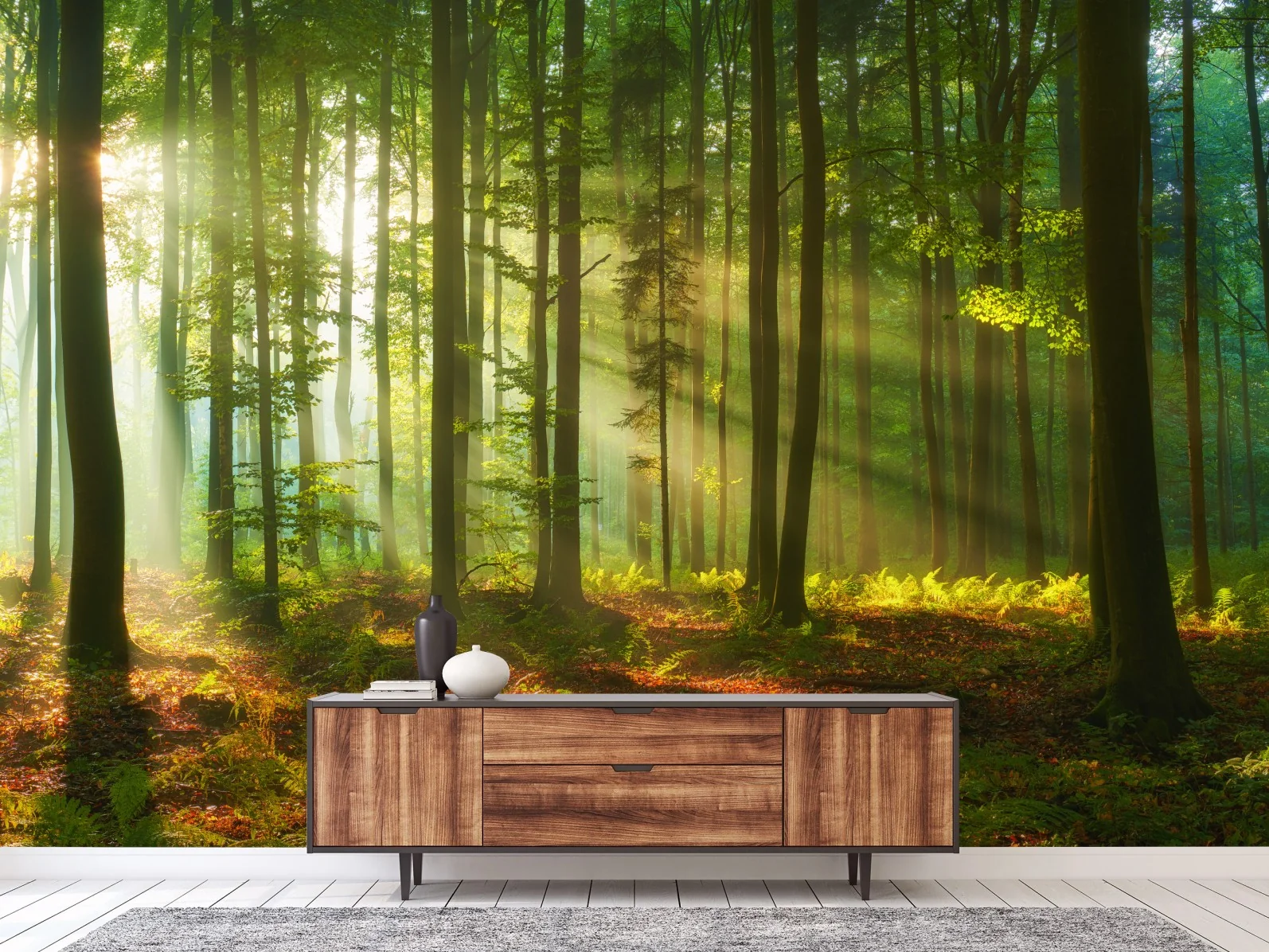 Fototapete Morgendliches licht im grünen wald