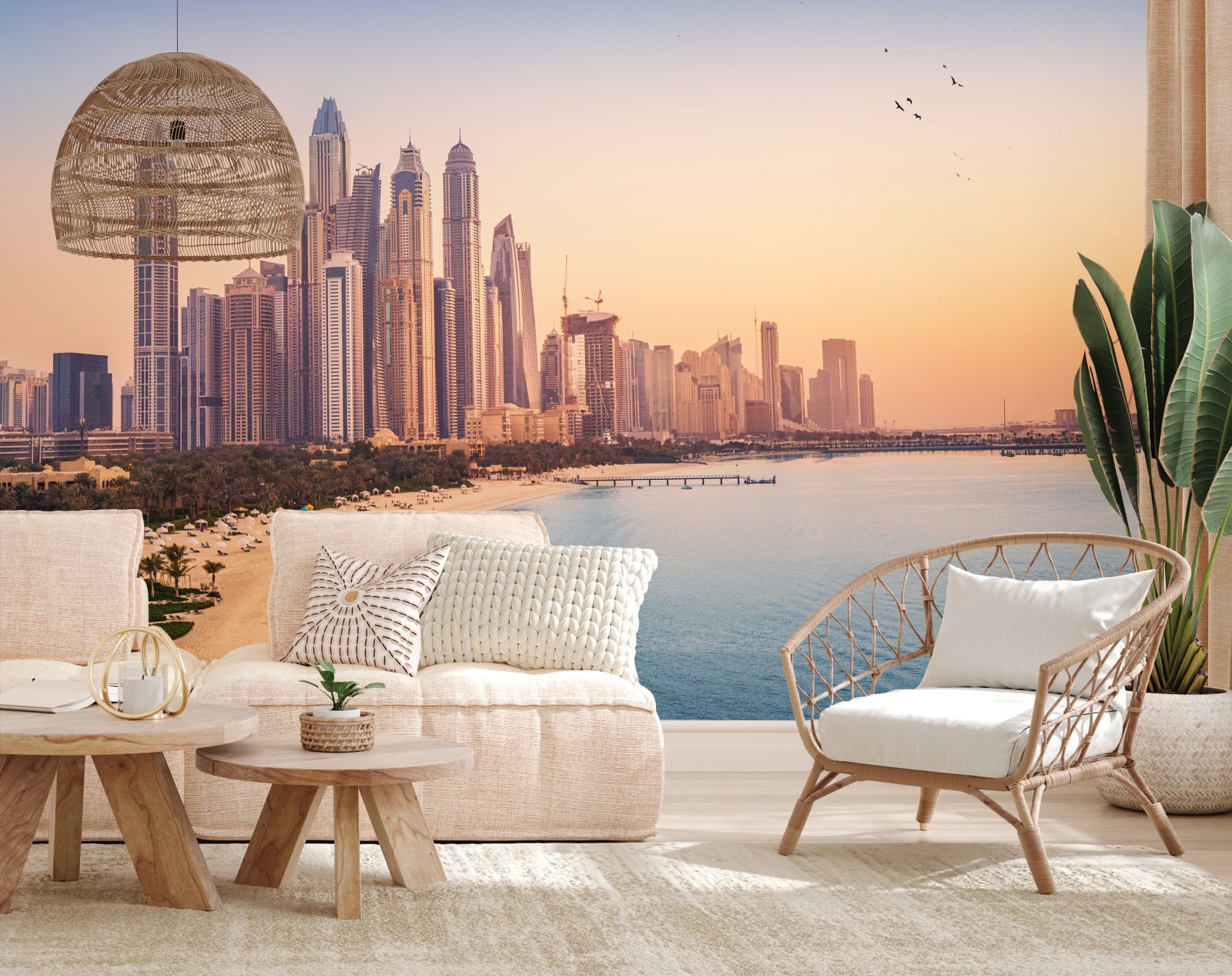- reisen, sonnenuntergang, wolkenkratzer, skyline, dubai, strand, ufer, palmen, stadtansicht, marina