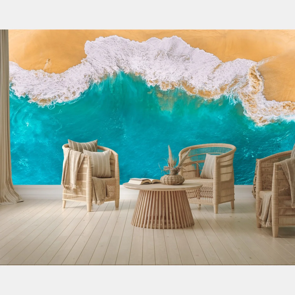 Bringen Sie Meeresruhe in Ihr Zuhause mit einer Luftaufnahme von türkisblauen Wellen am Strand von Kelingking, Nusa Penida.MehrWeniger