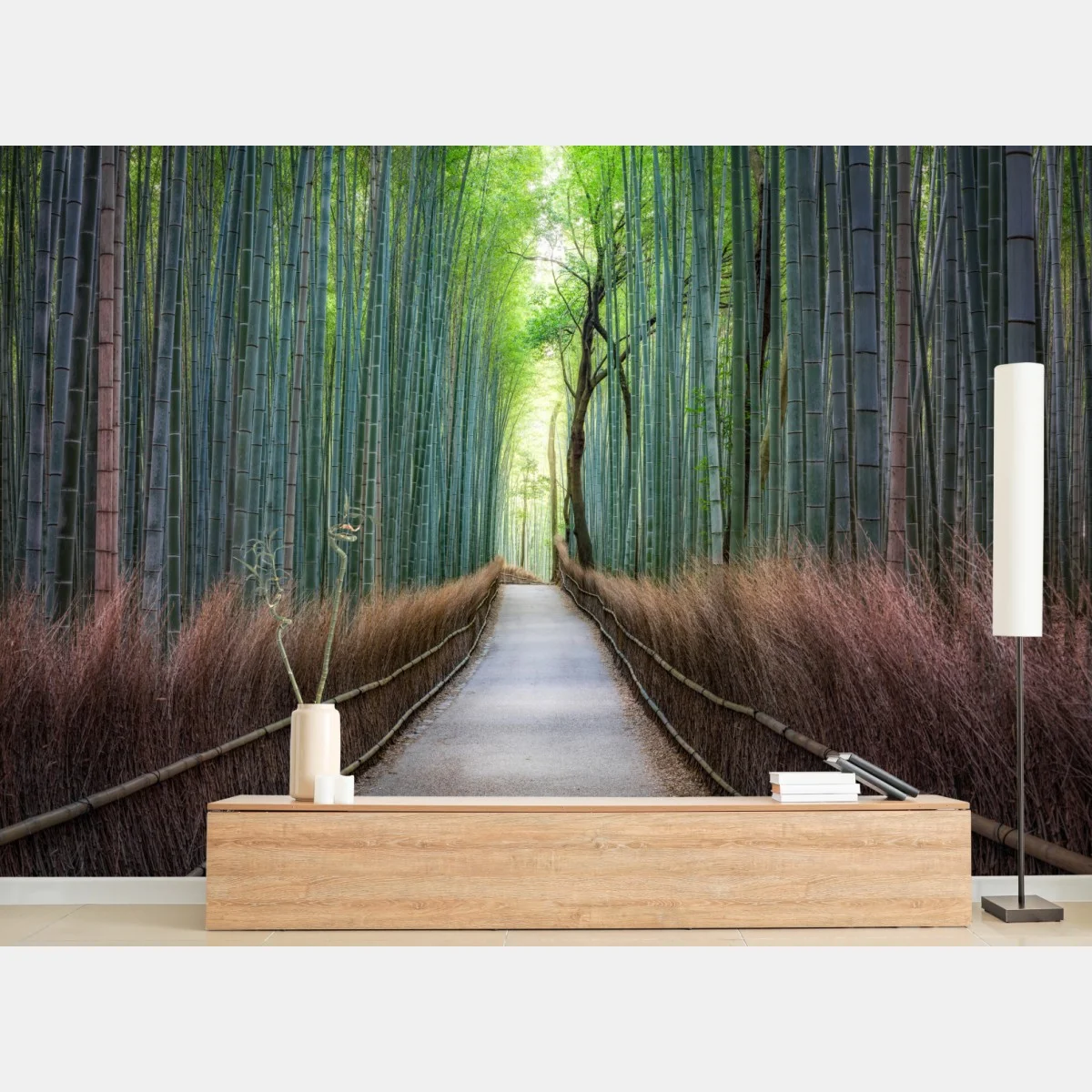 Bringen Sie Ruhe in Ihr Zuhause mit diesem ruhigen Bambuswaldweg, der einen Pfad zeigt, der von hohen Bambusstangen und weichem, natürlichem Licht umrahmt ist.MehrWeniger