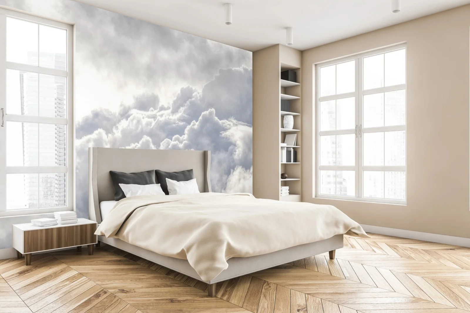 Beruhende wolkenlandschaft in sanften weißen und grauen tönen die jedem raum leichtigkeit und ruhe verleiht.MehrWeniger