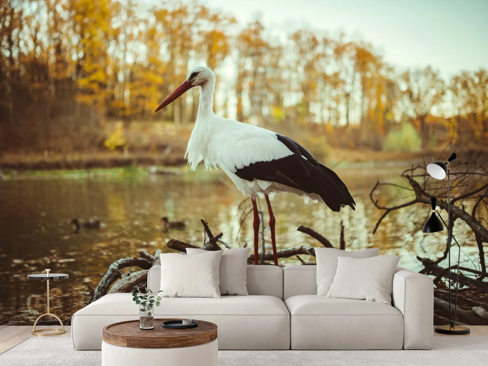 Bringen Sie ruhige herbstliche Natur in Ihr Zuhause mit einem eleganten weißen Storch am stillen See.MehrWeniger