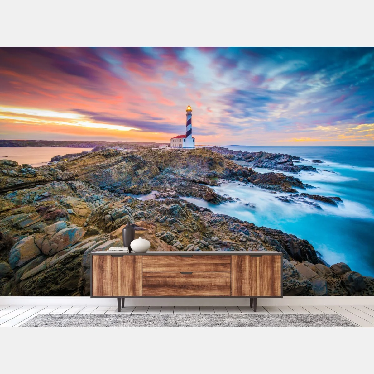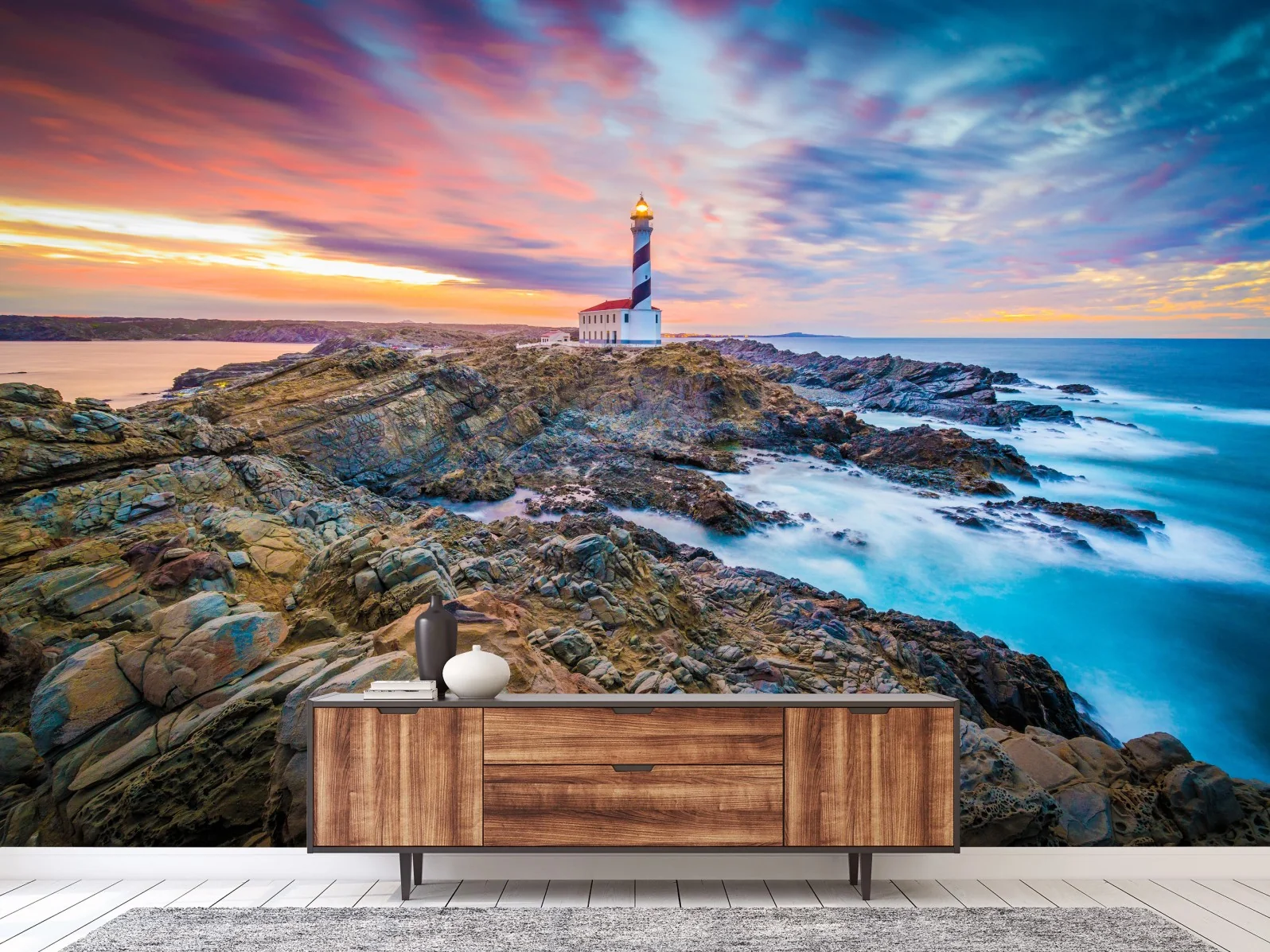 Fototapete Sonnenuntergang bei leuchtturm Favaritx, Menorca