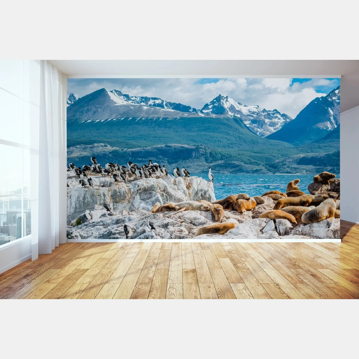 Fototapete Seelöwen und seevögel an der felsküste